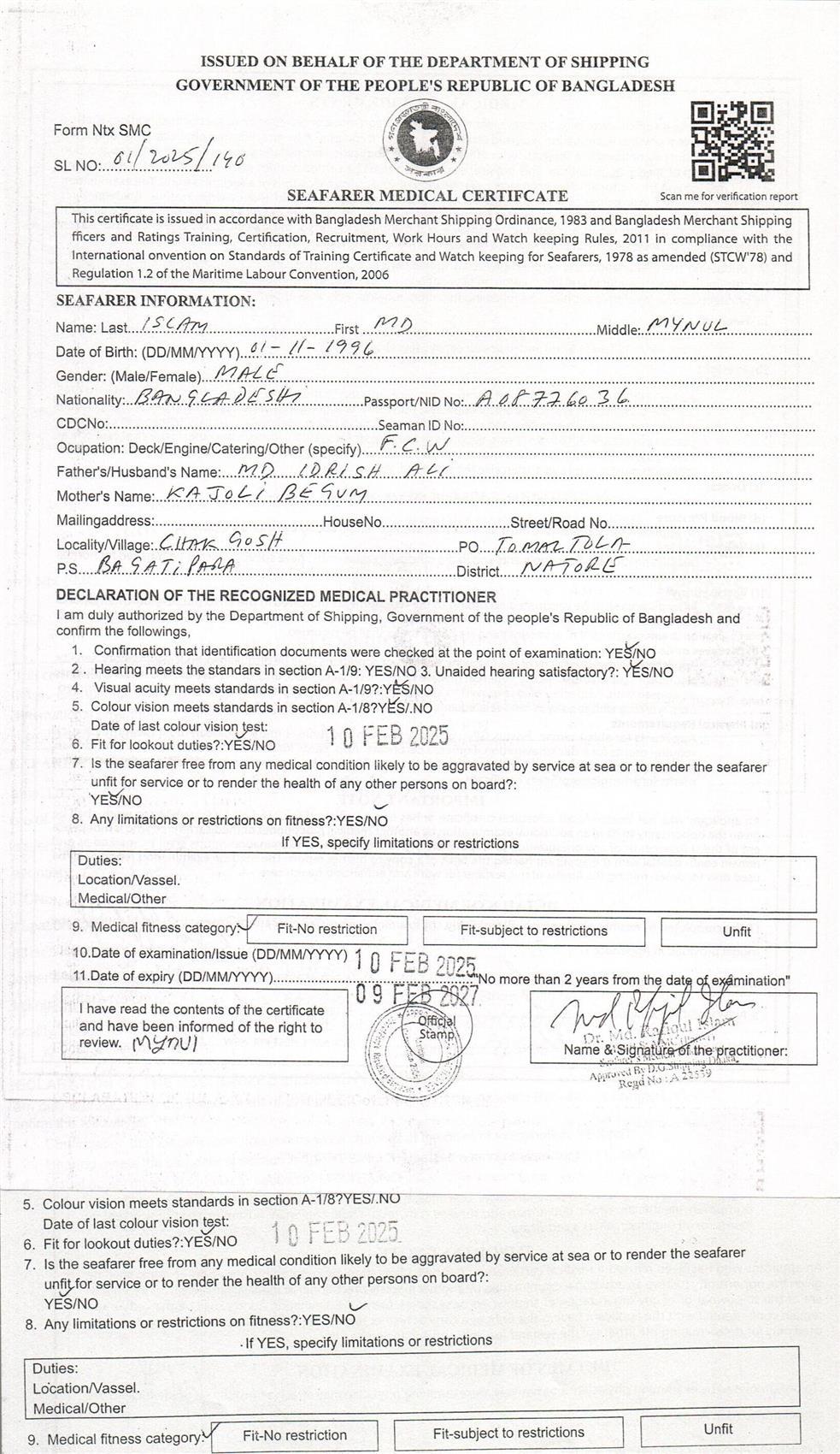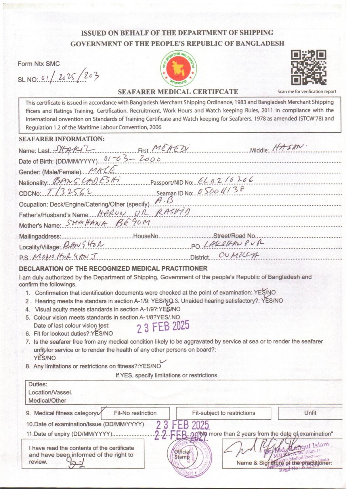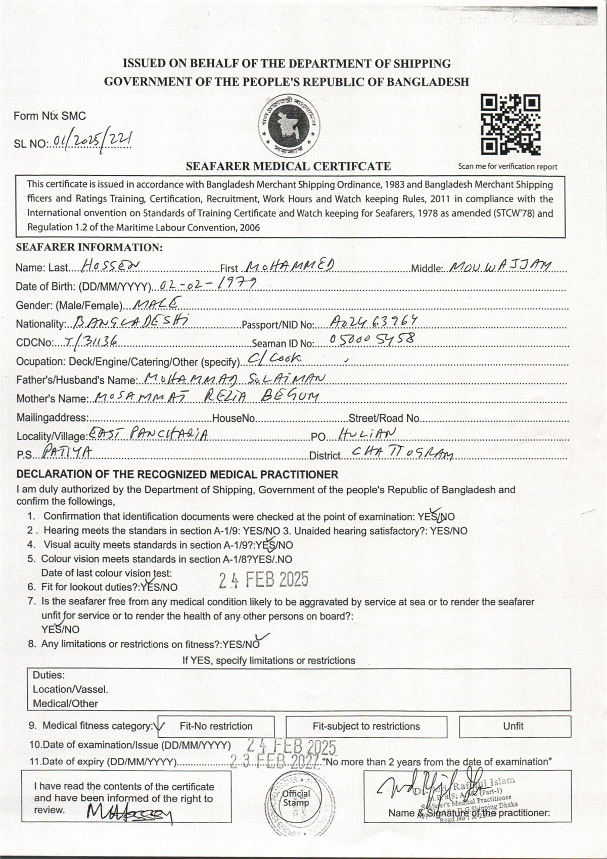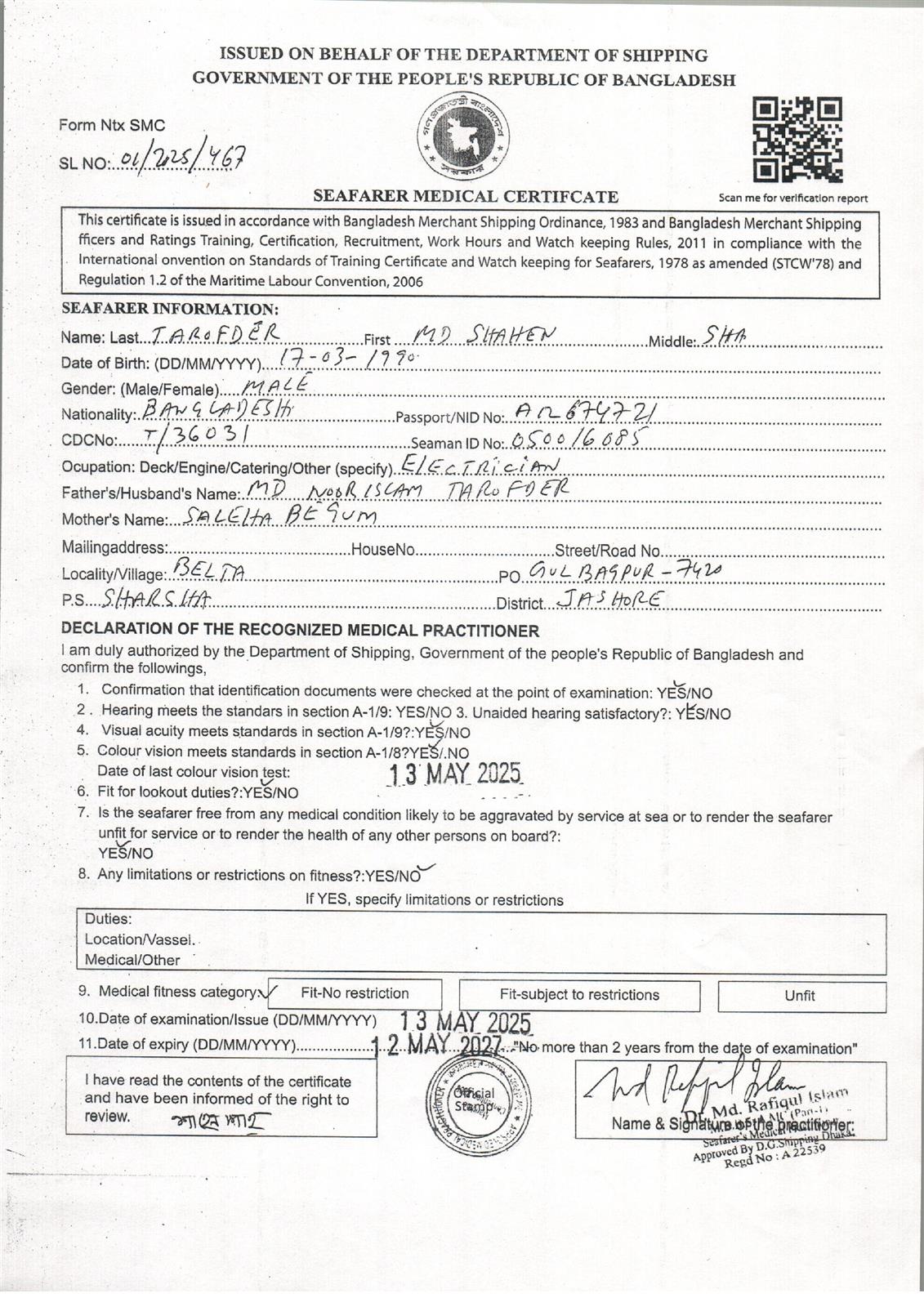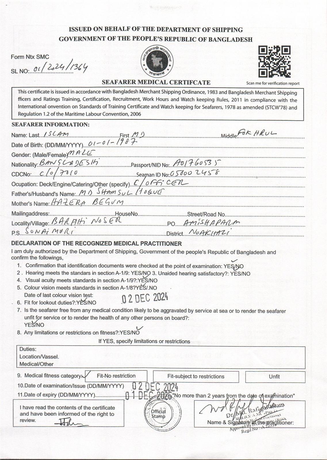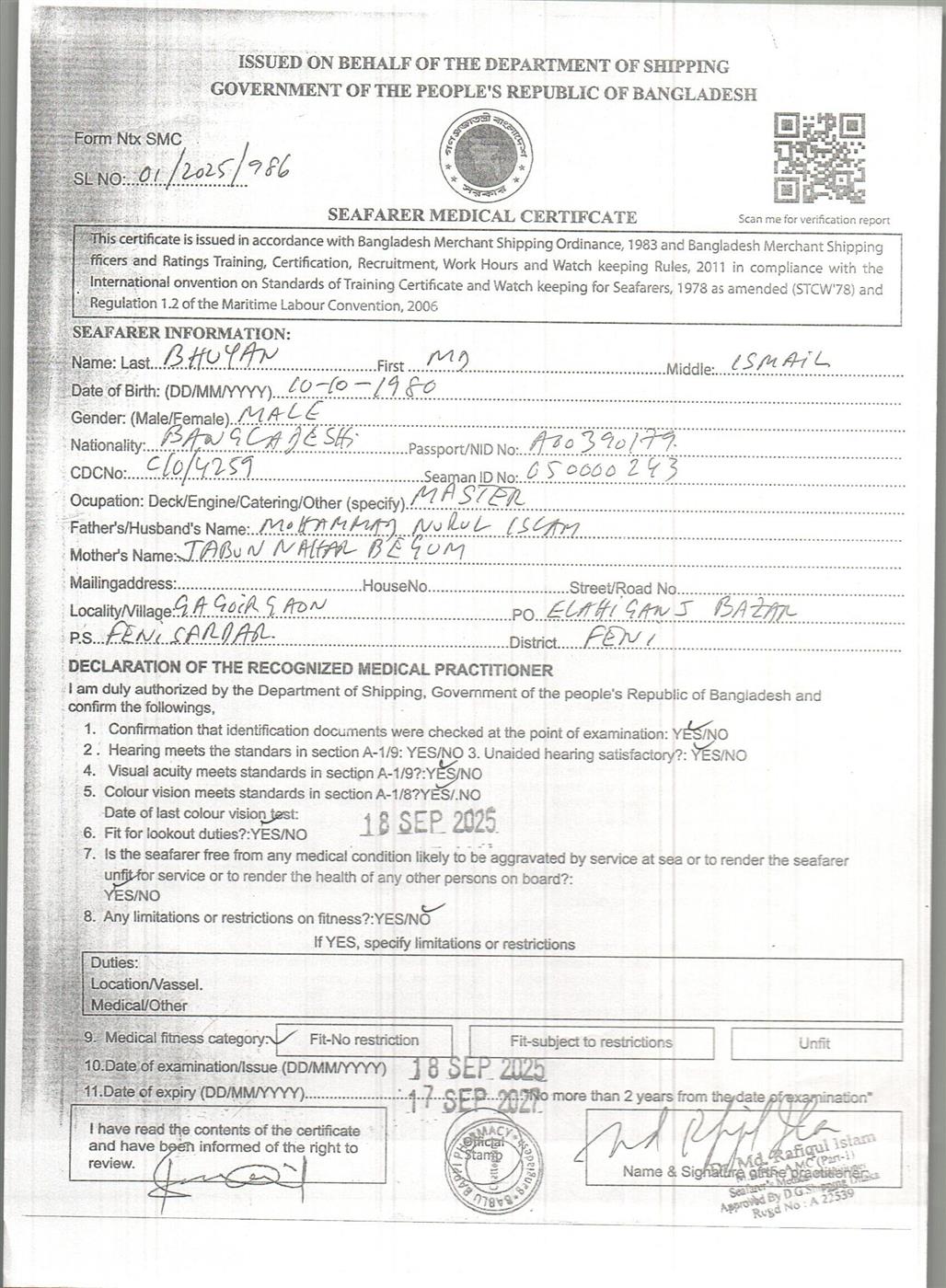 1.. SEAFARER MEDICAL CERTIFICATE