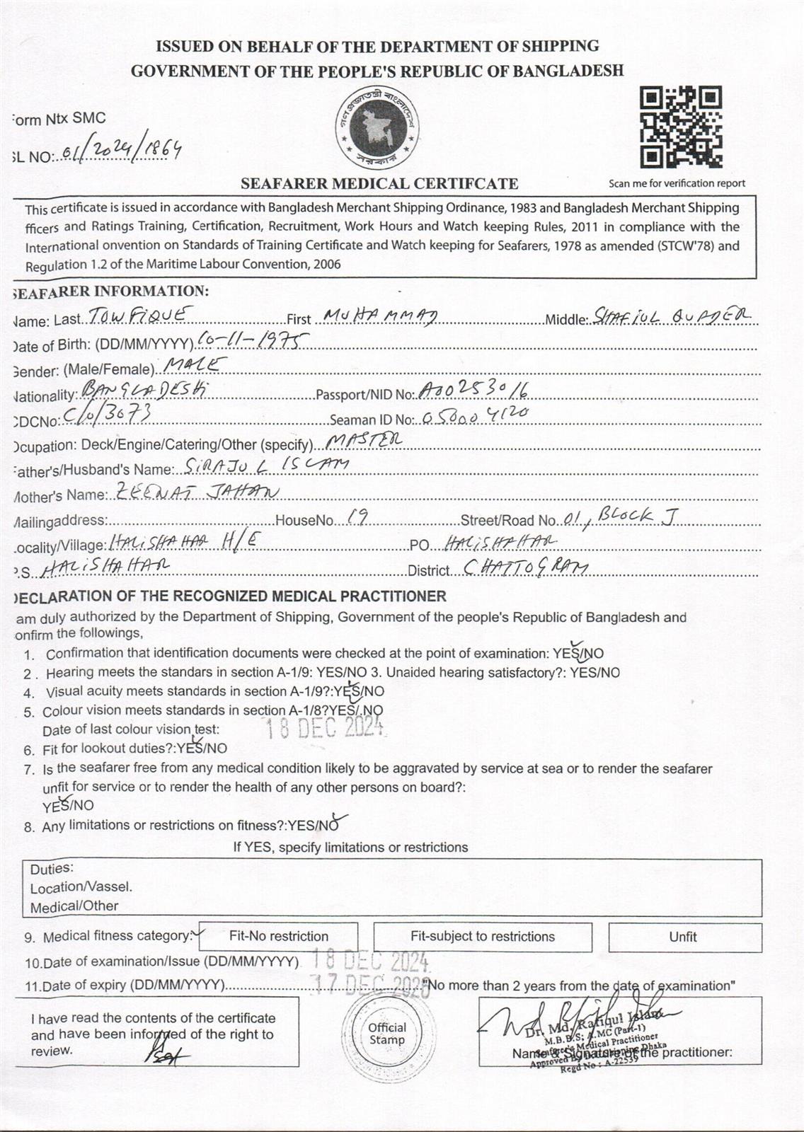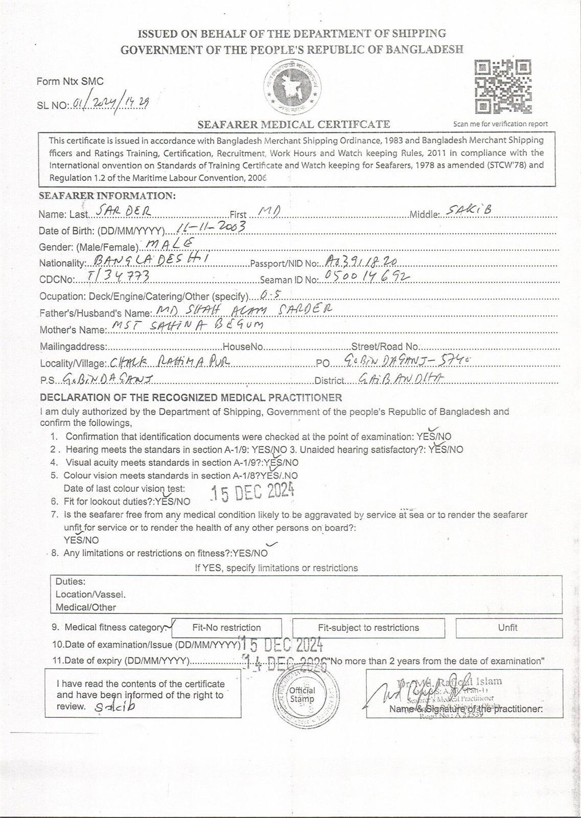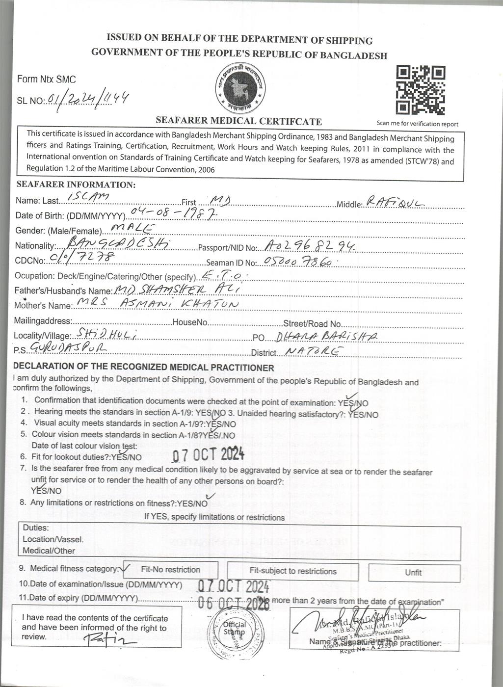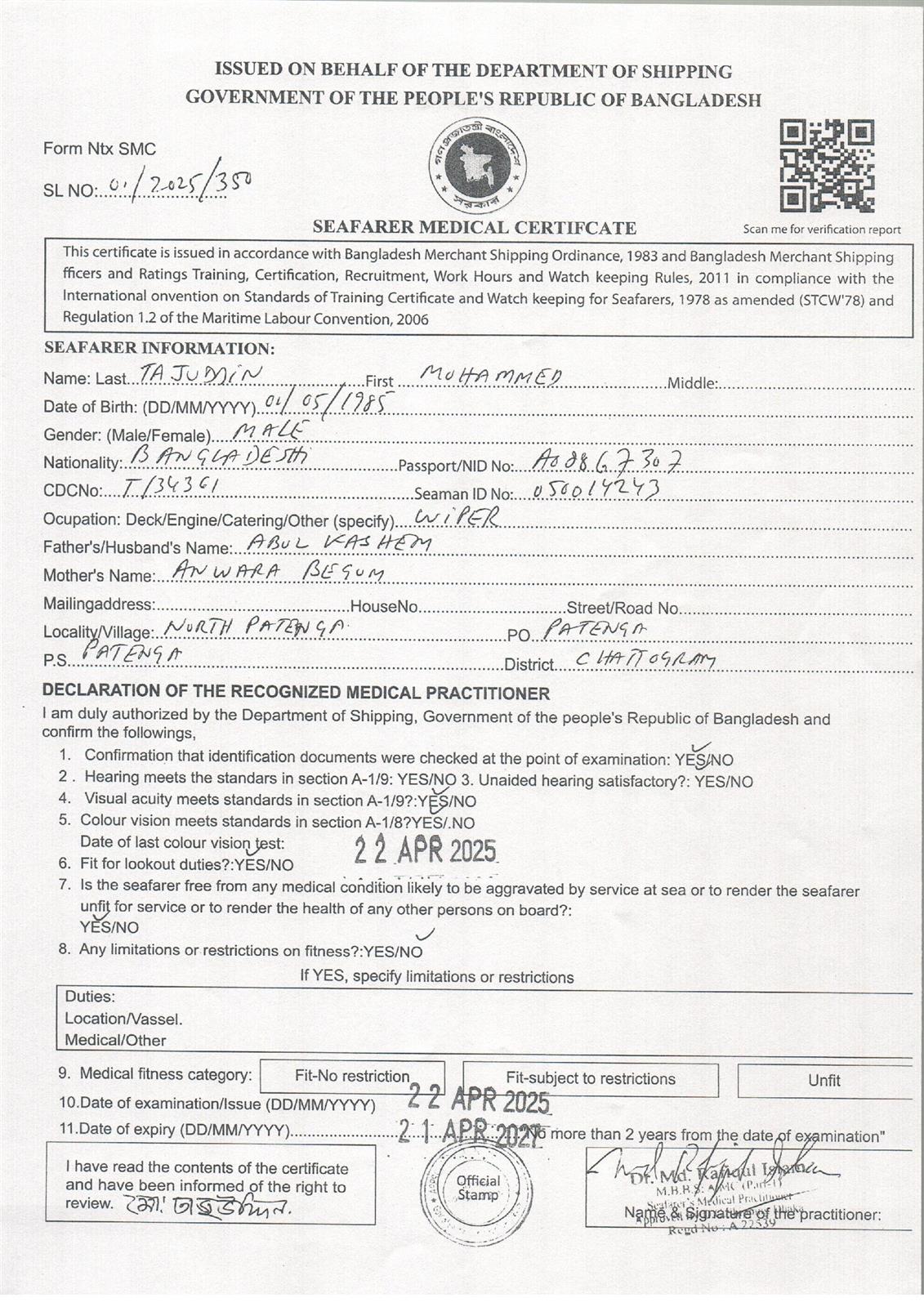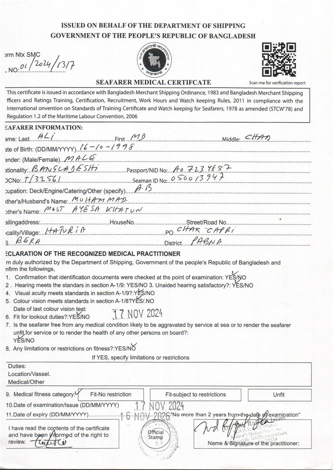 1.. SEAFARER MEDICAL CERTIFICATE