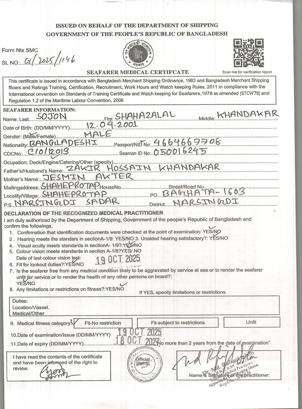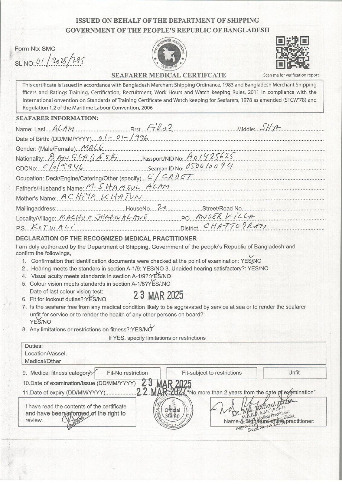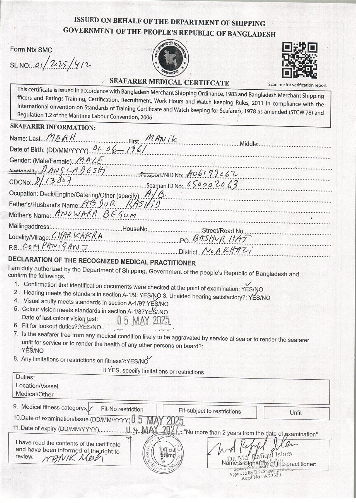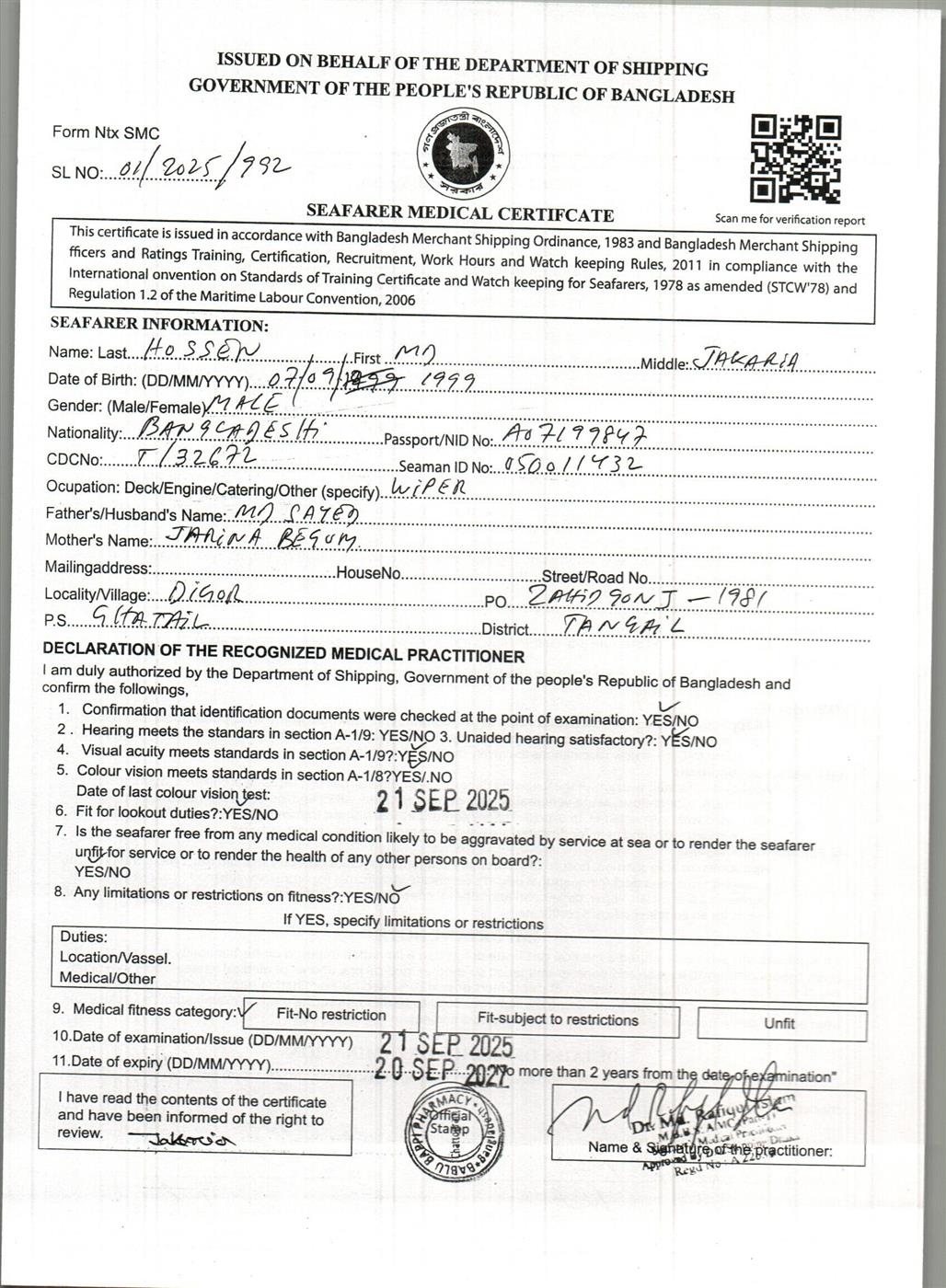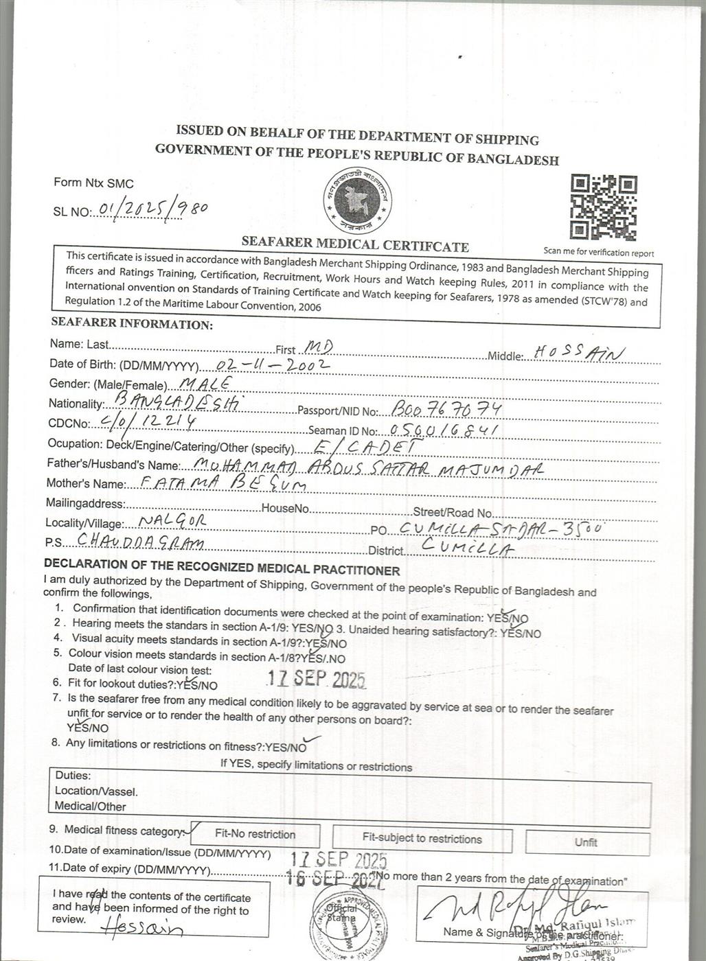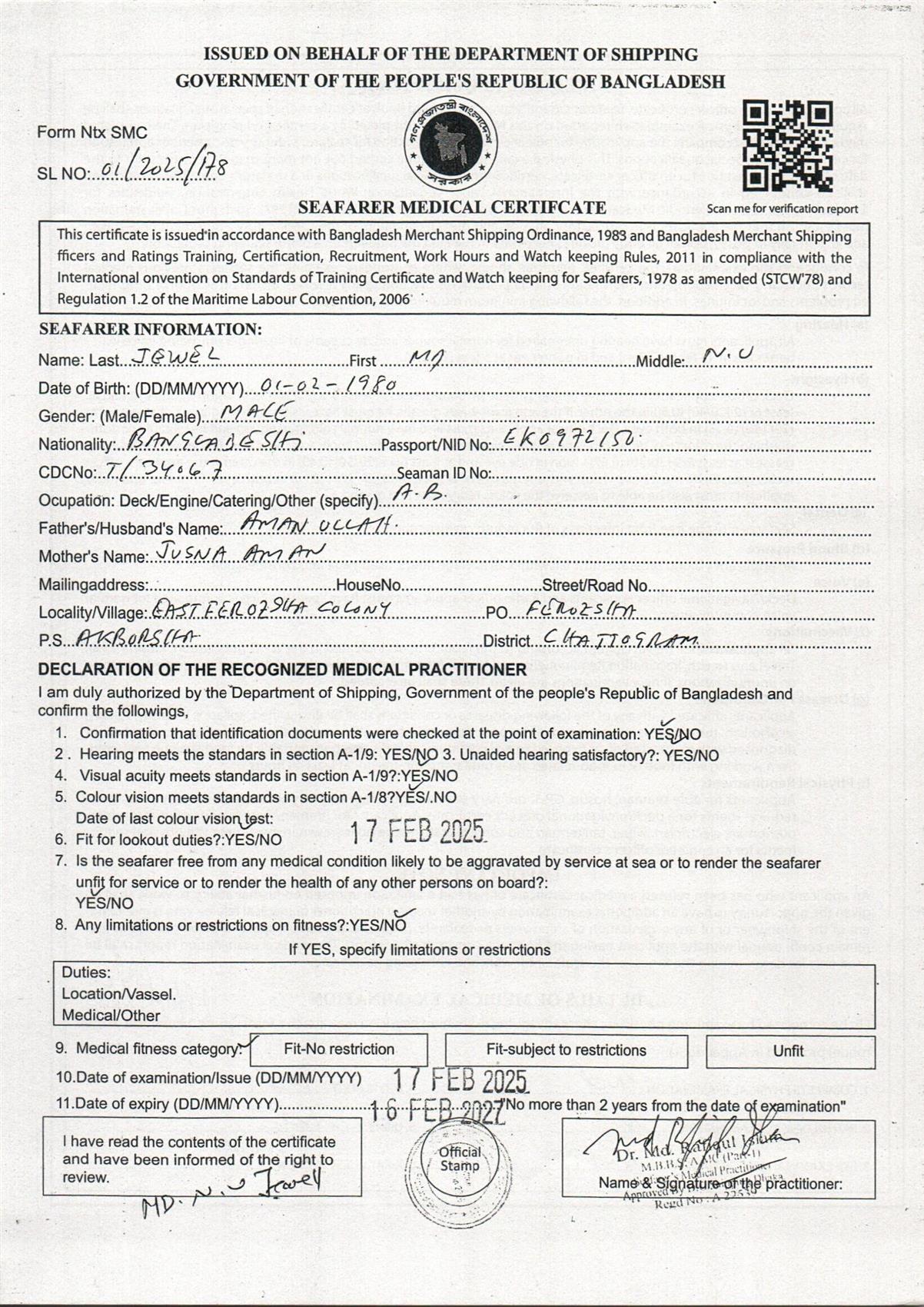 1.. SEAFARER MEDICAL CERTIFICATE