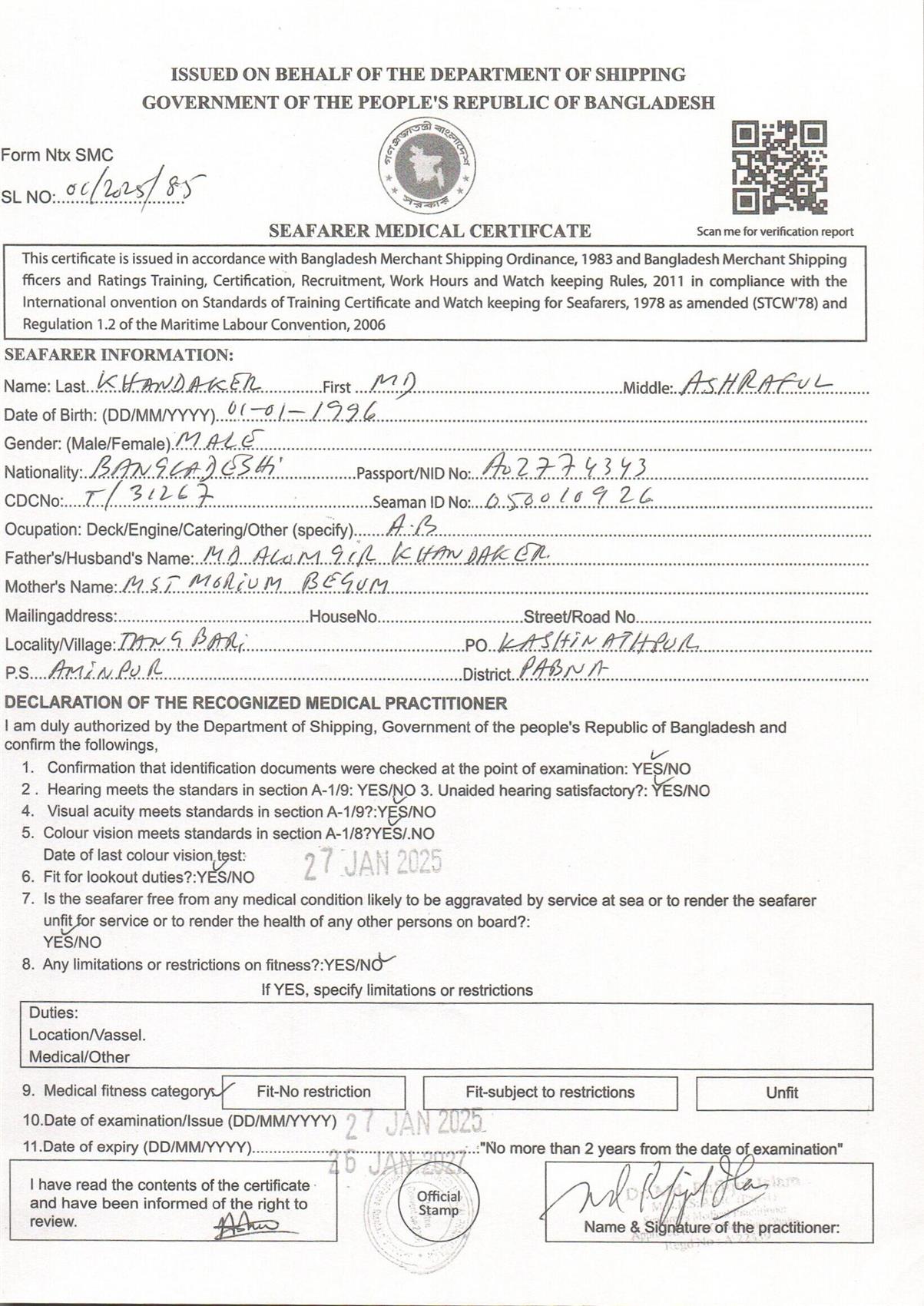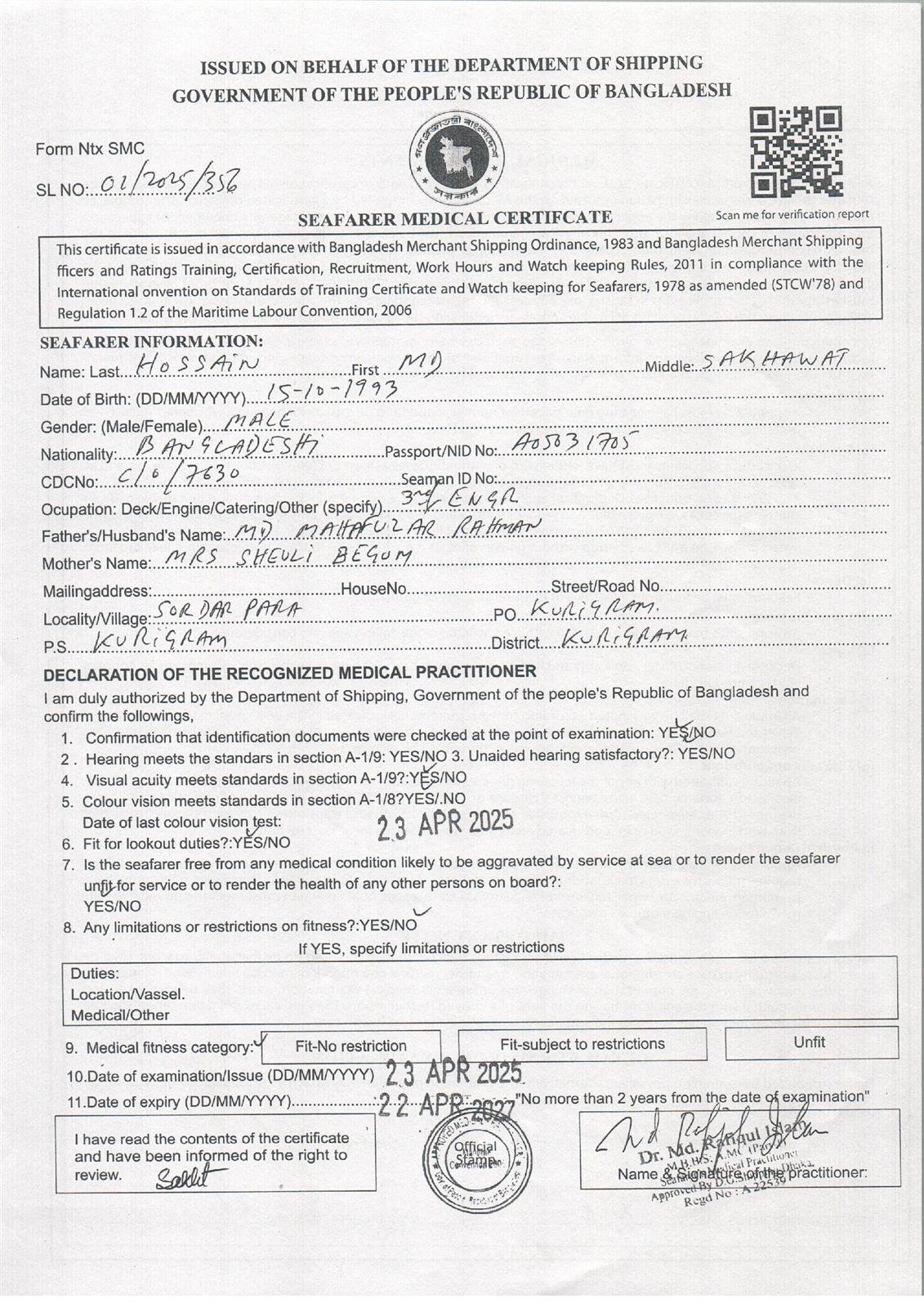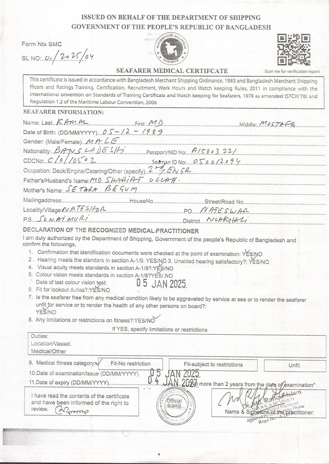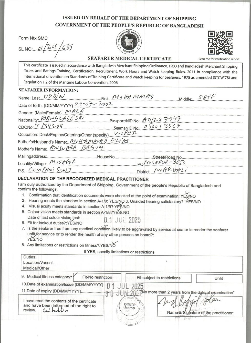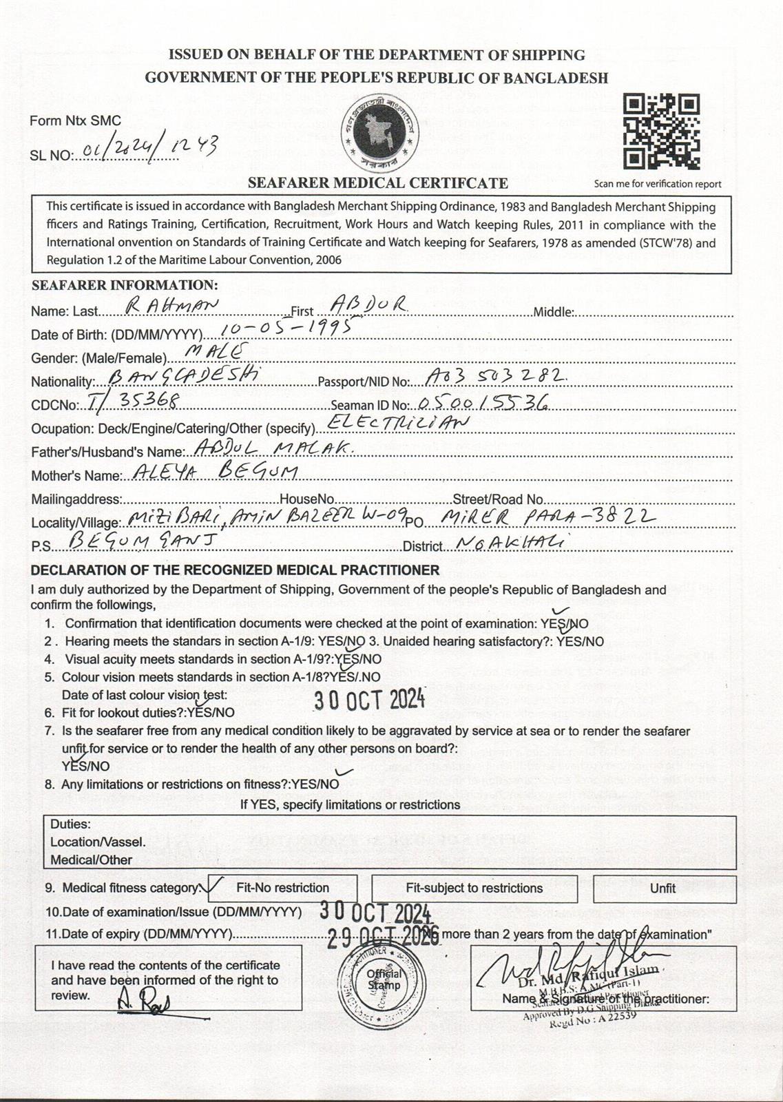 1.. SEAFARER MEDICAL CERTIFICATE