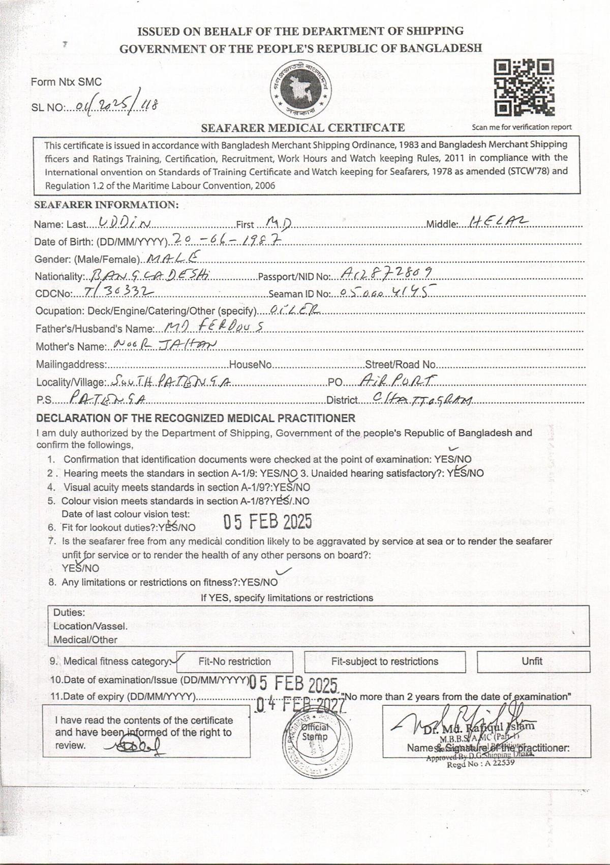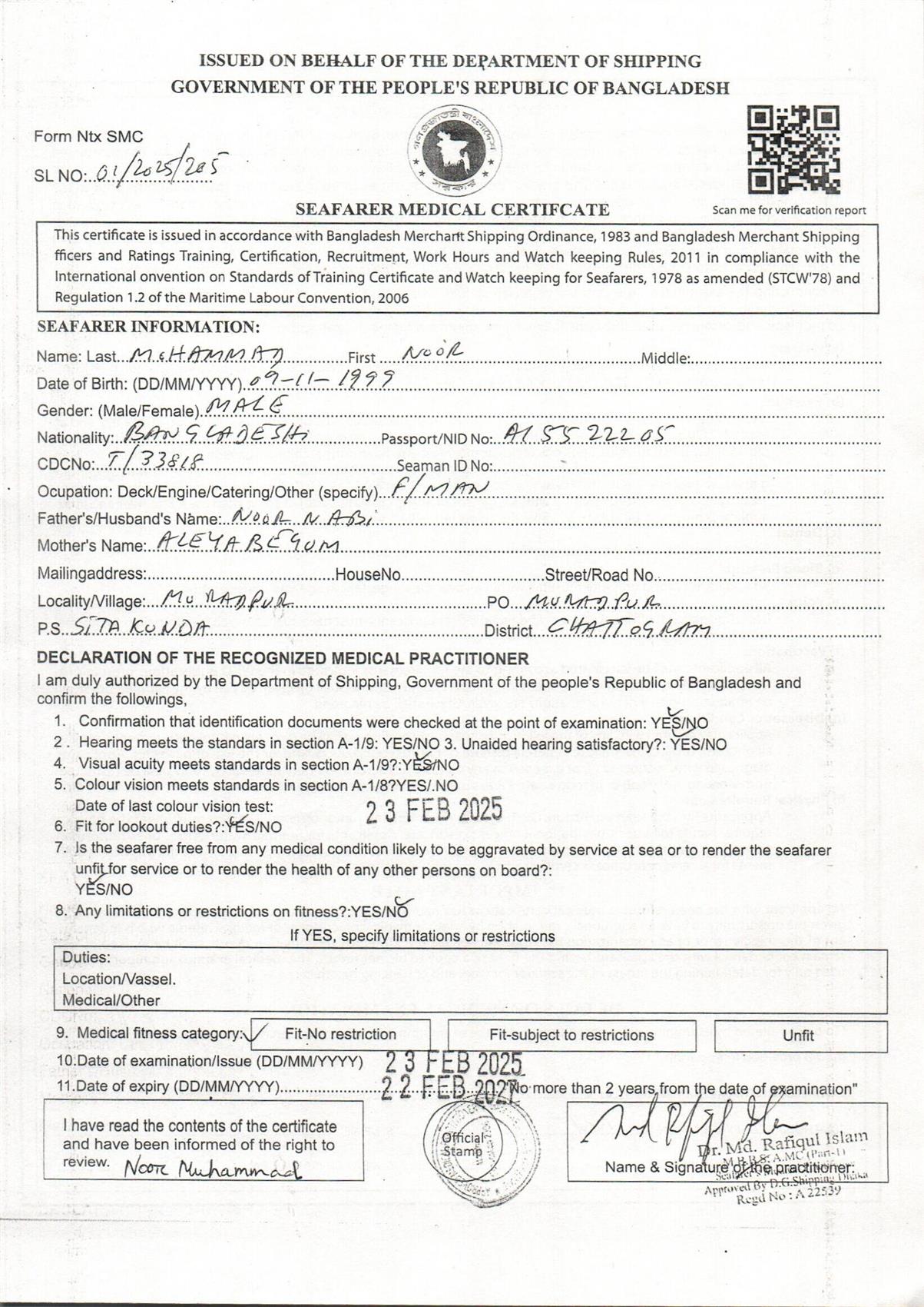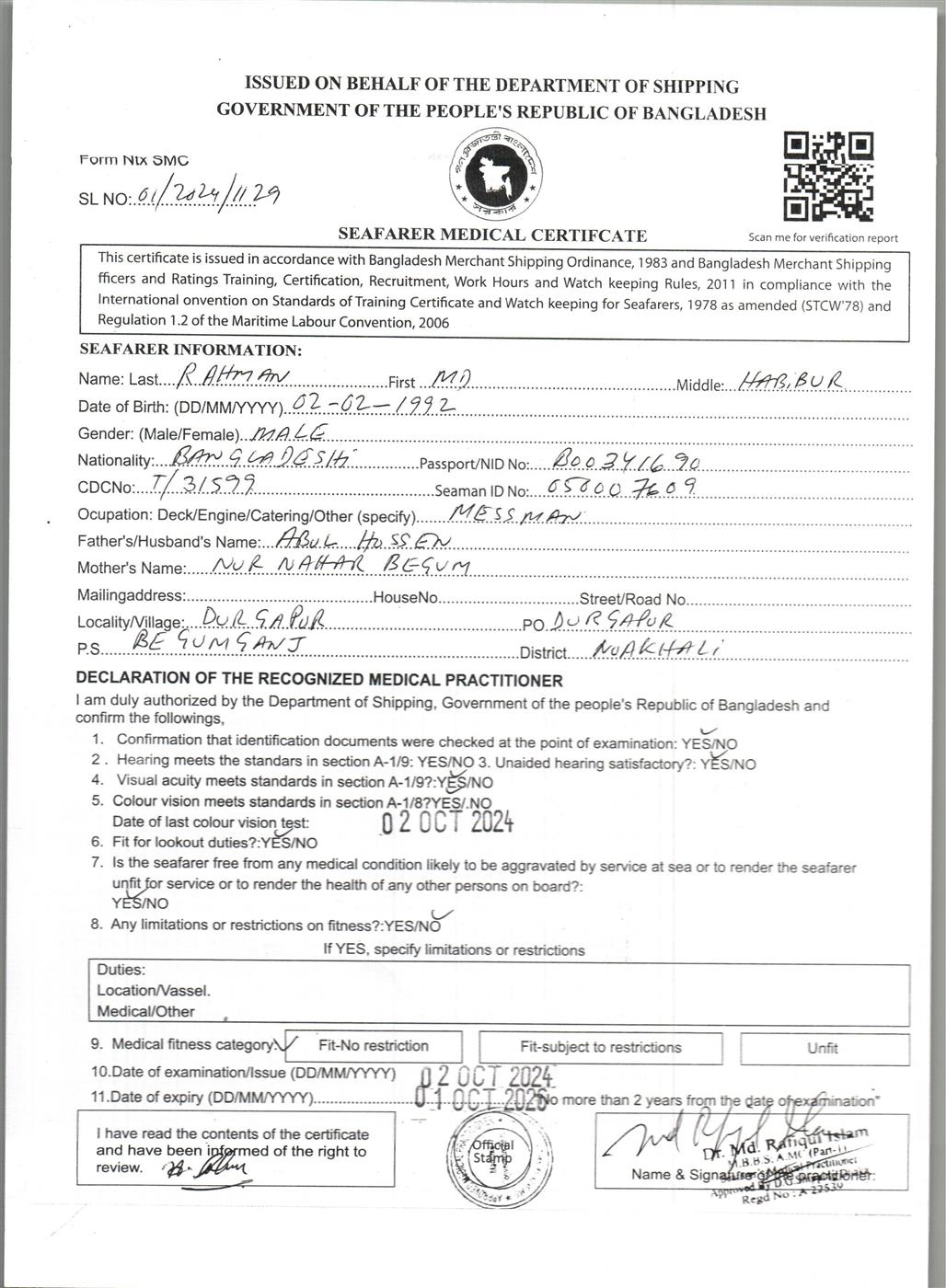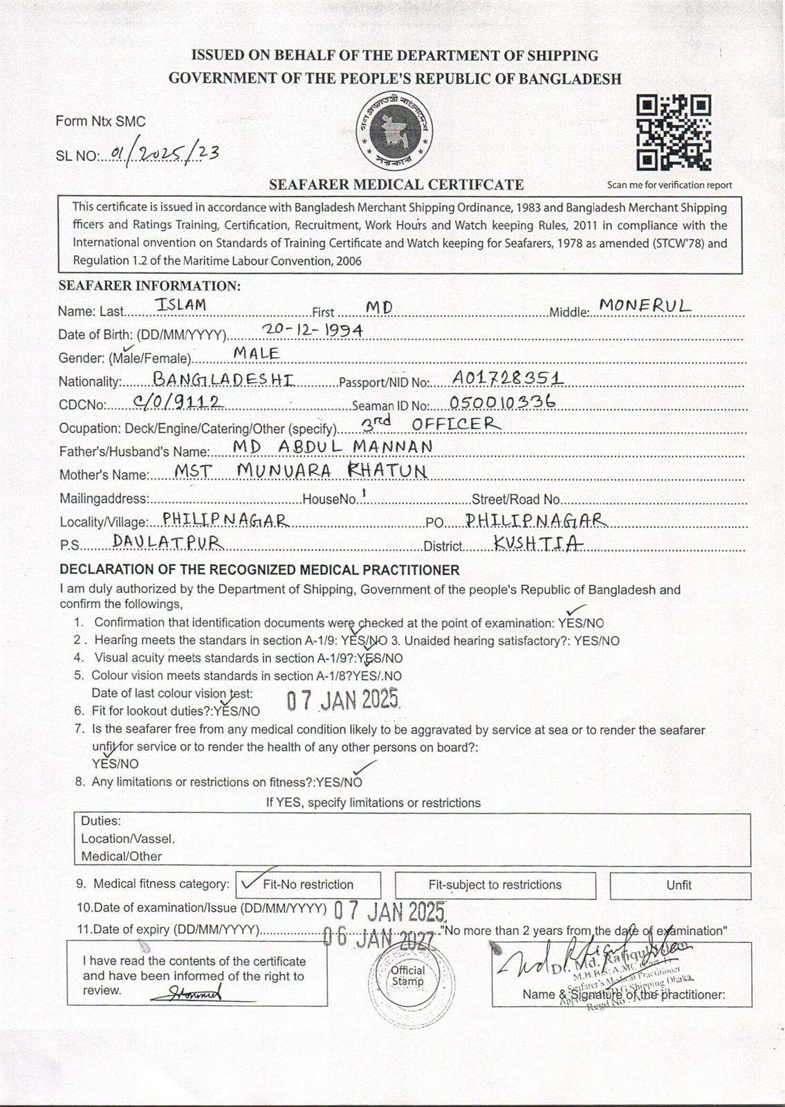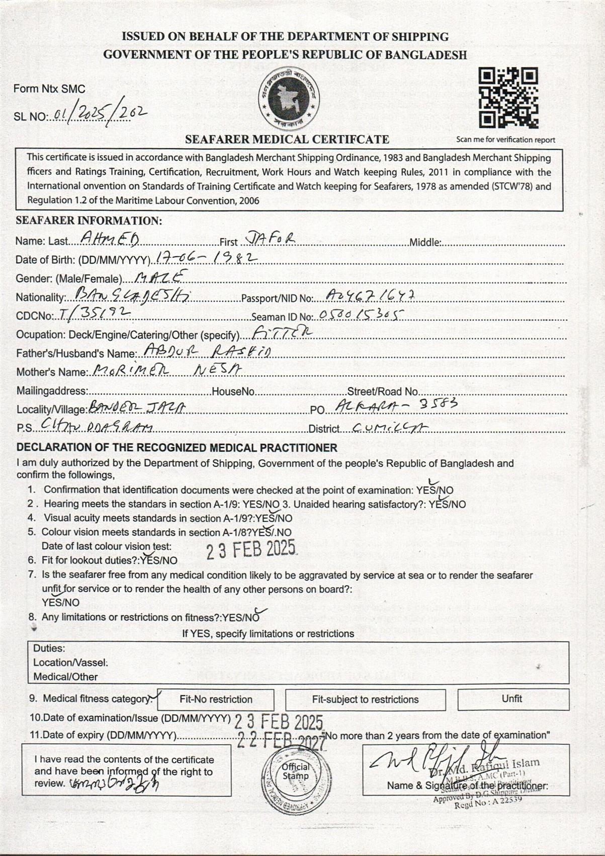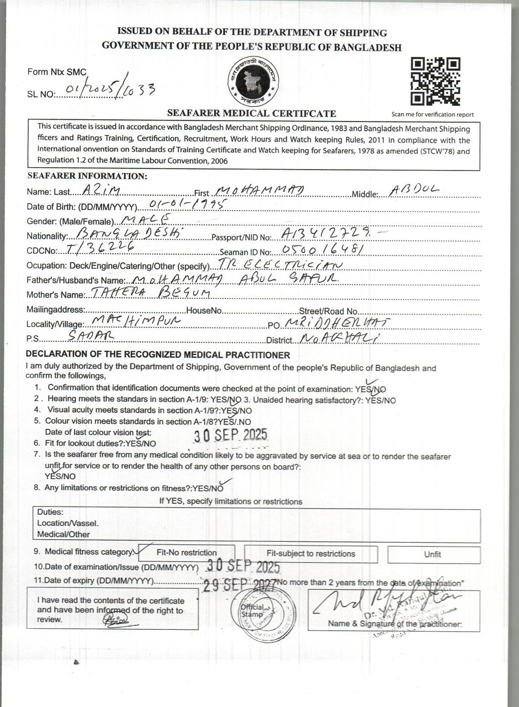 1.. SEAFARER MEDICAL CERTIFICATE