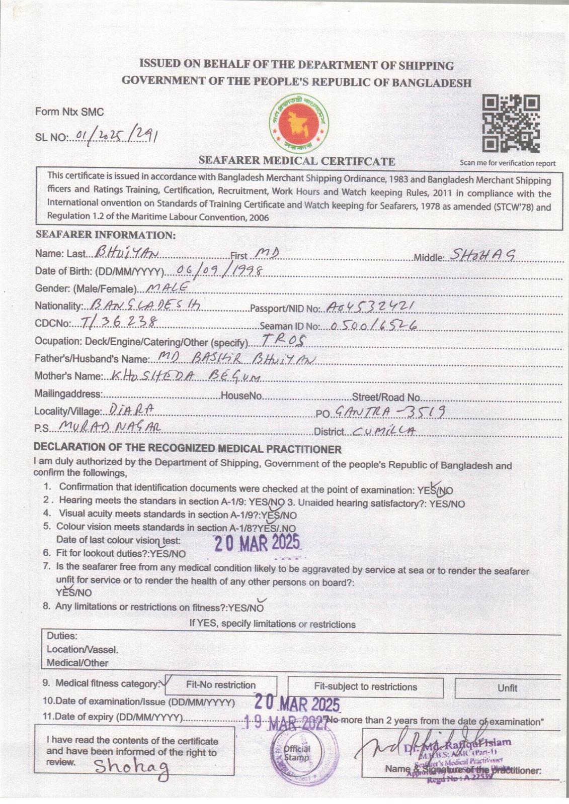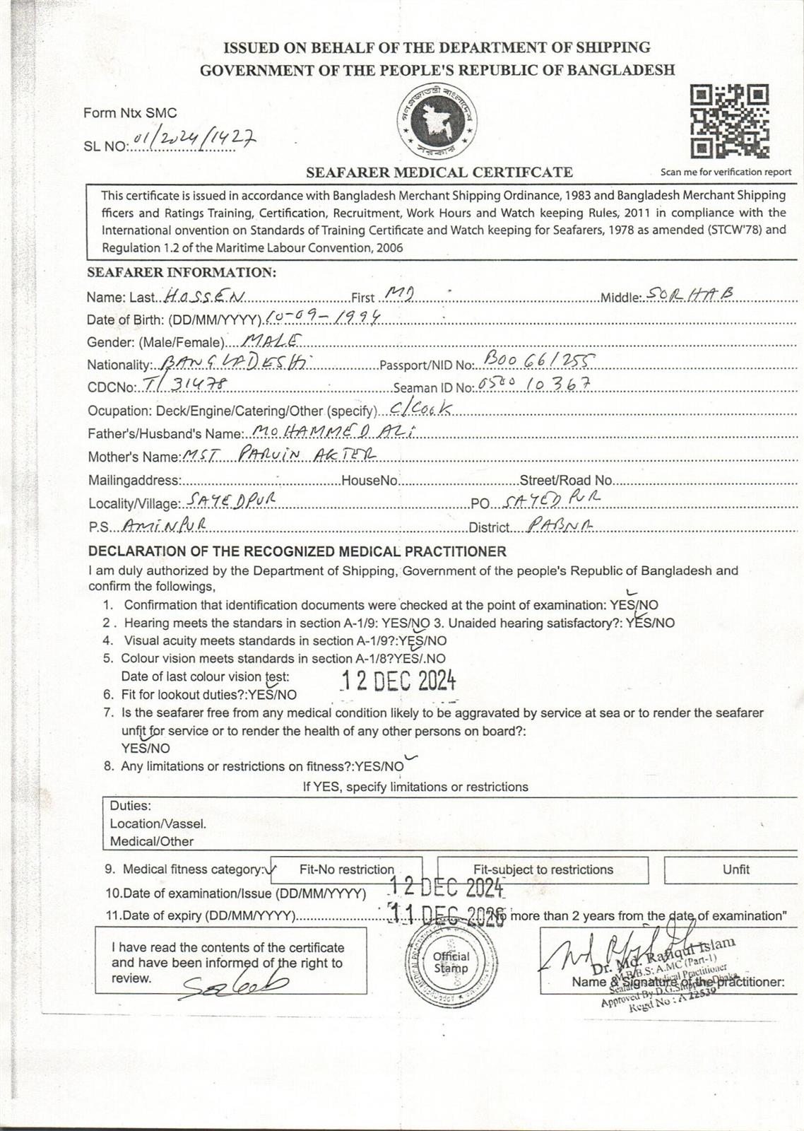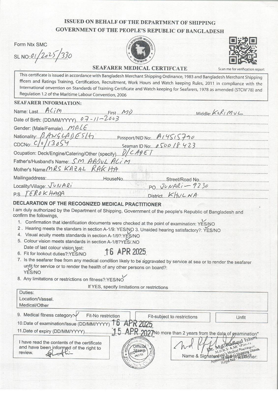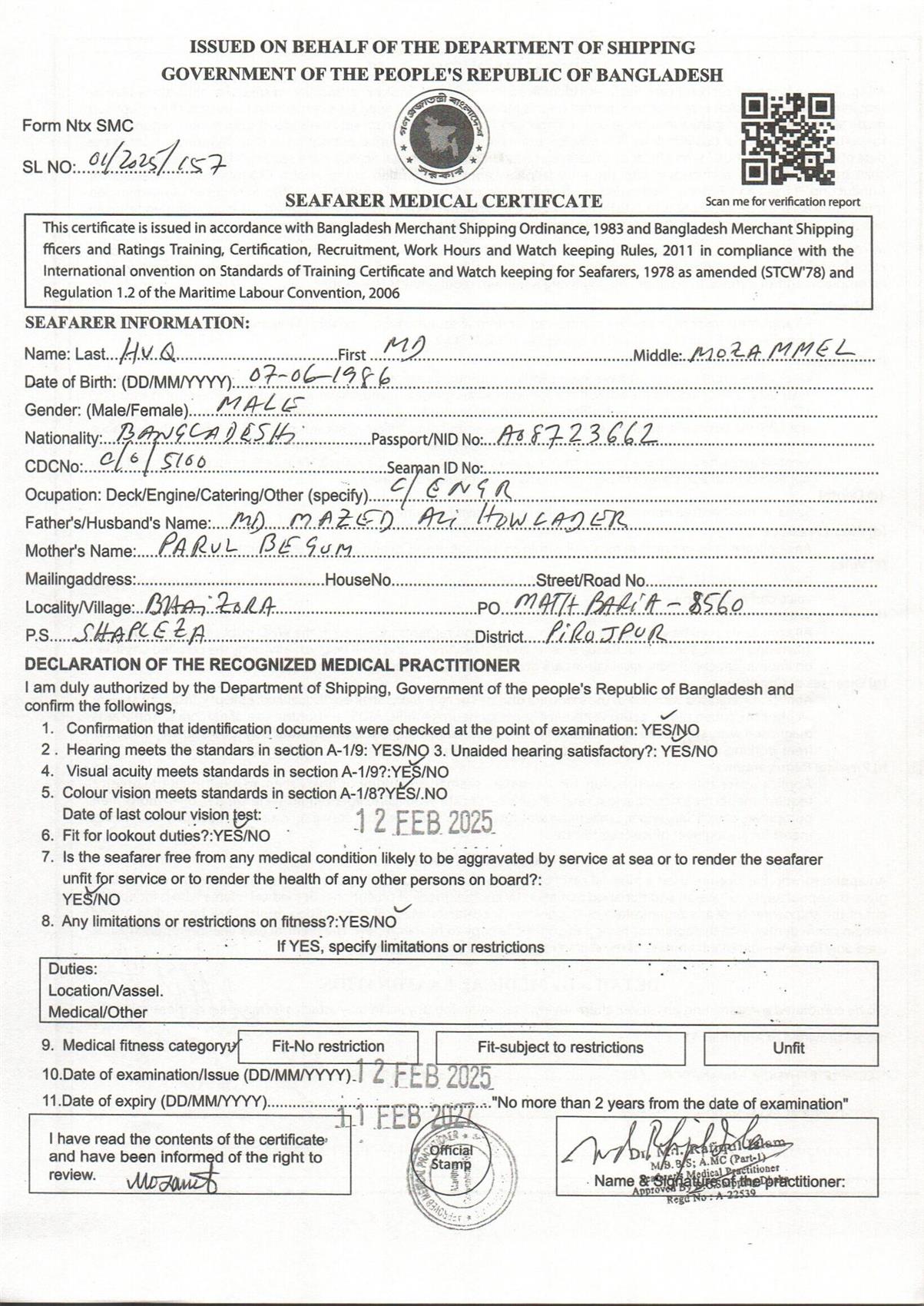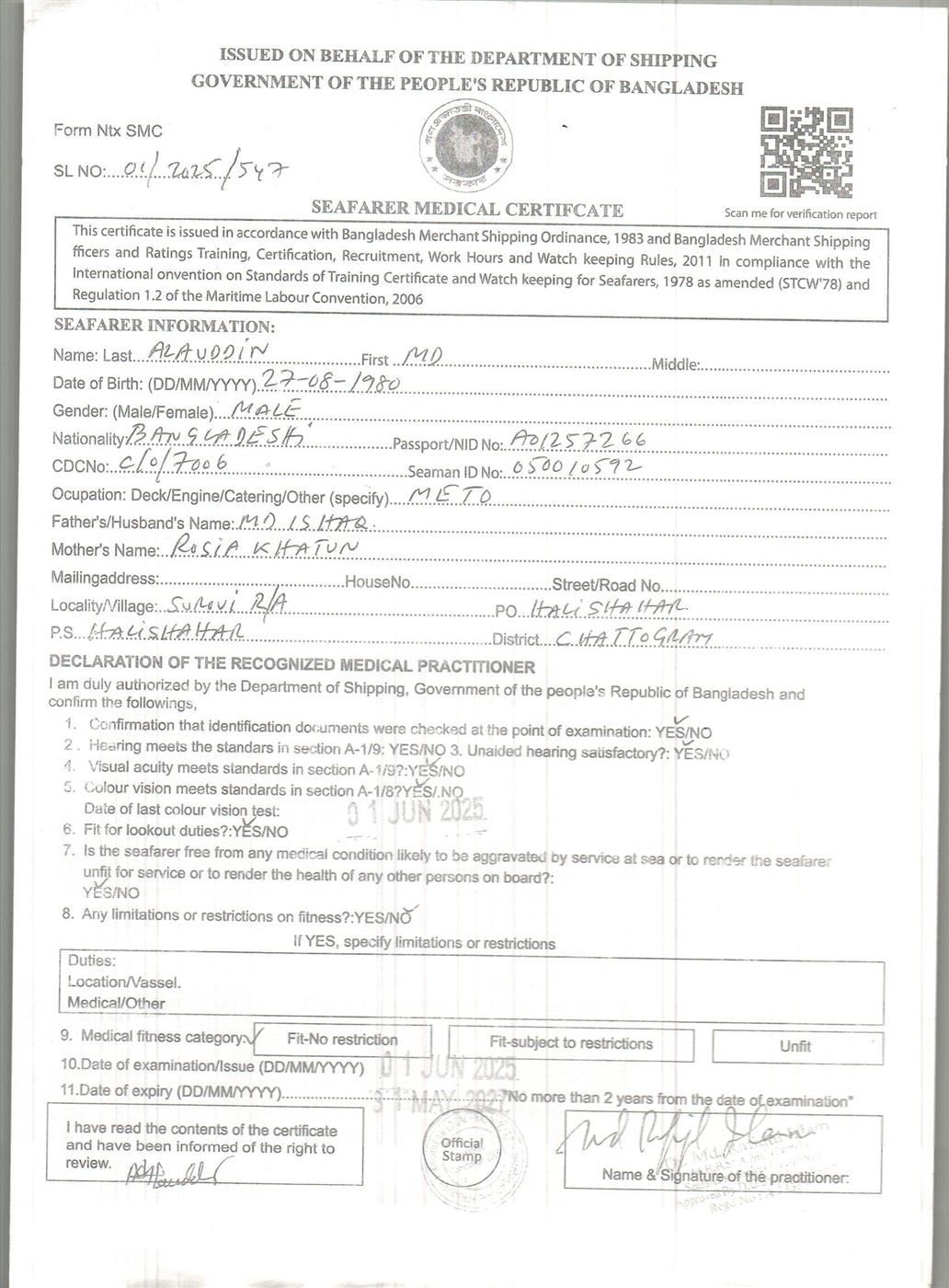 1.. SEAFARER MEDICAL CERTIFICATE