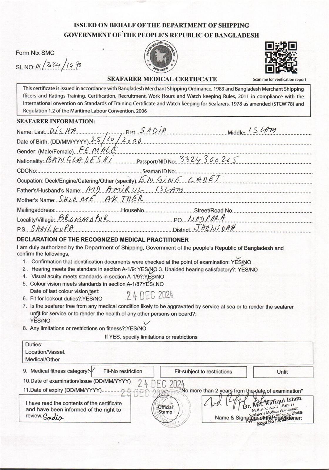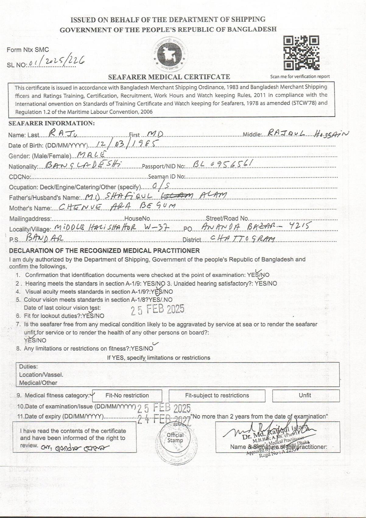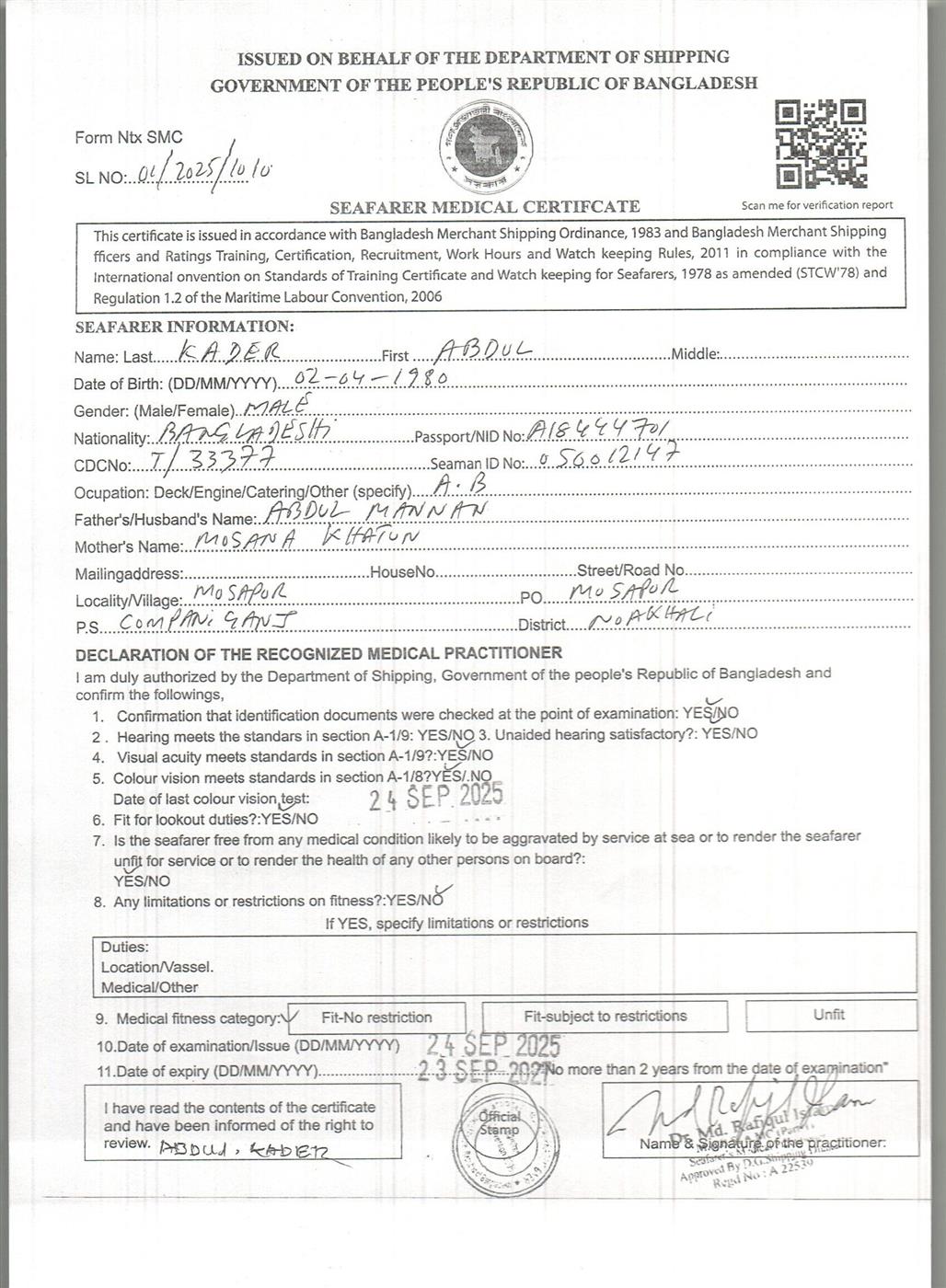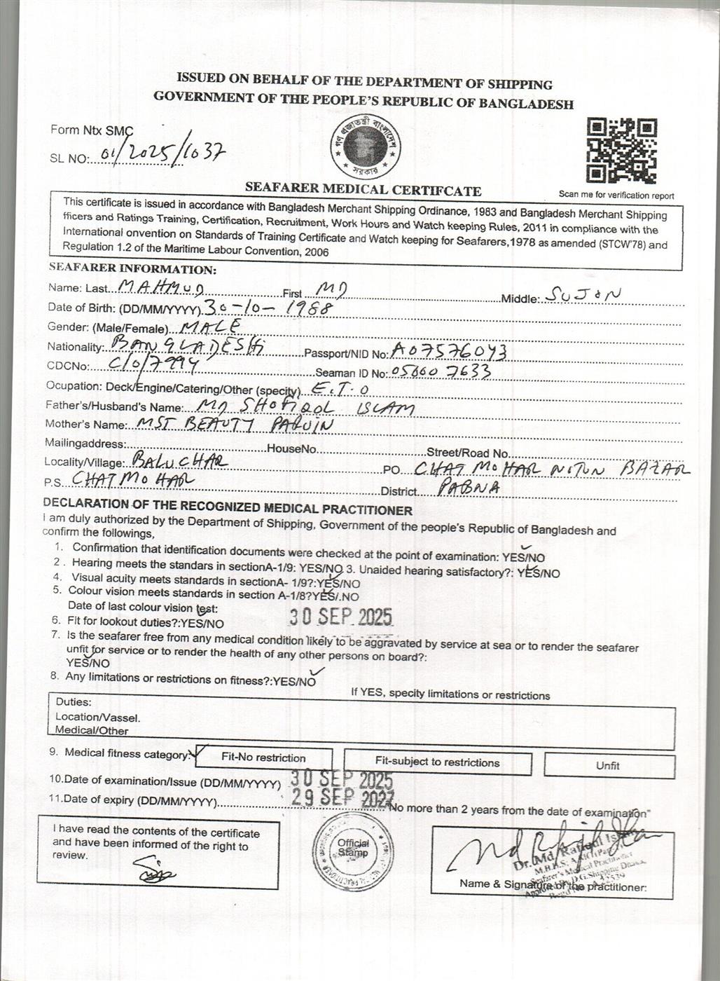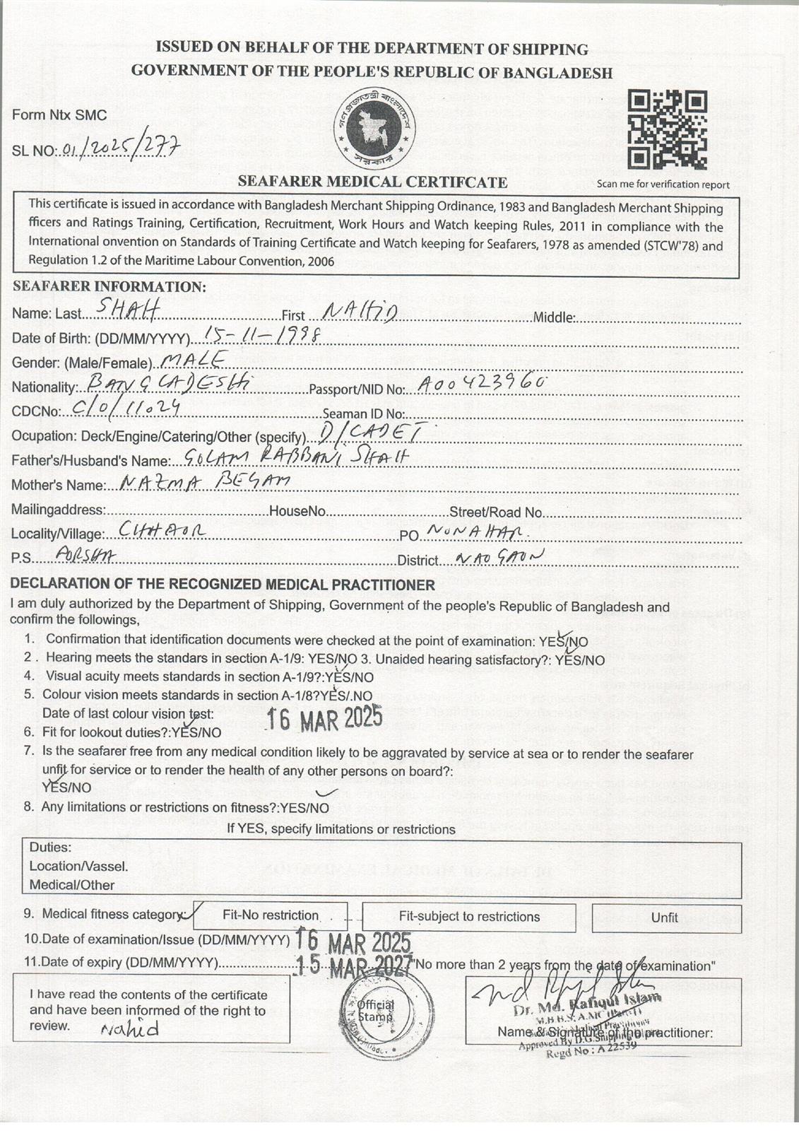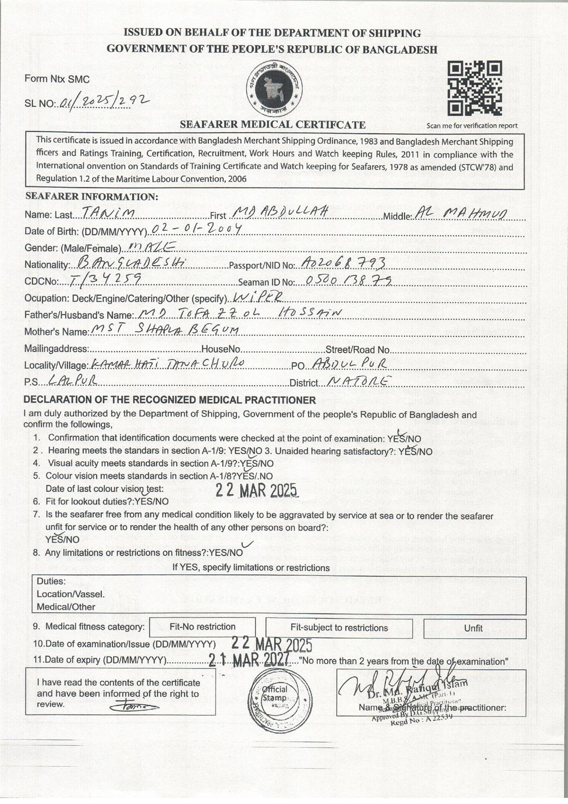 1.. SEAFARER MEDICAL CERTIFICATE