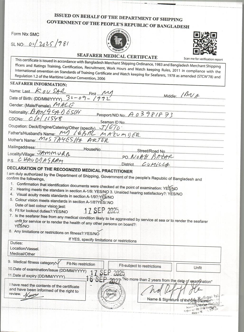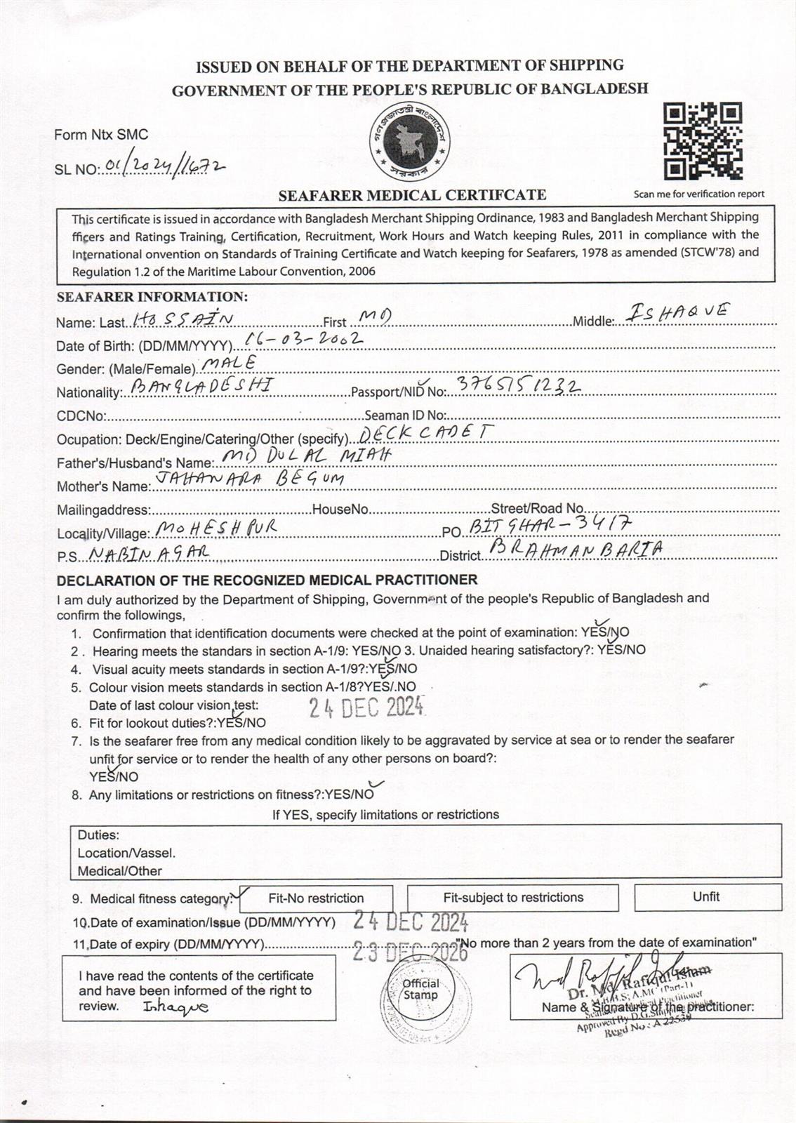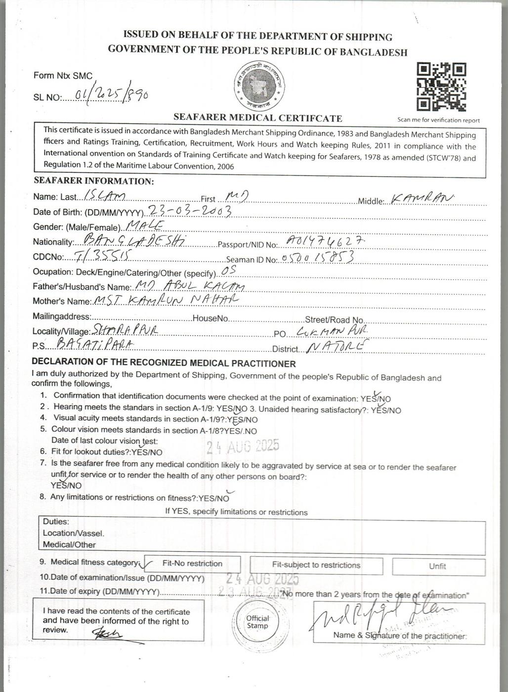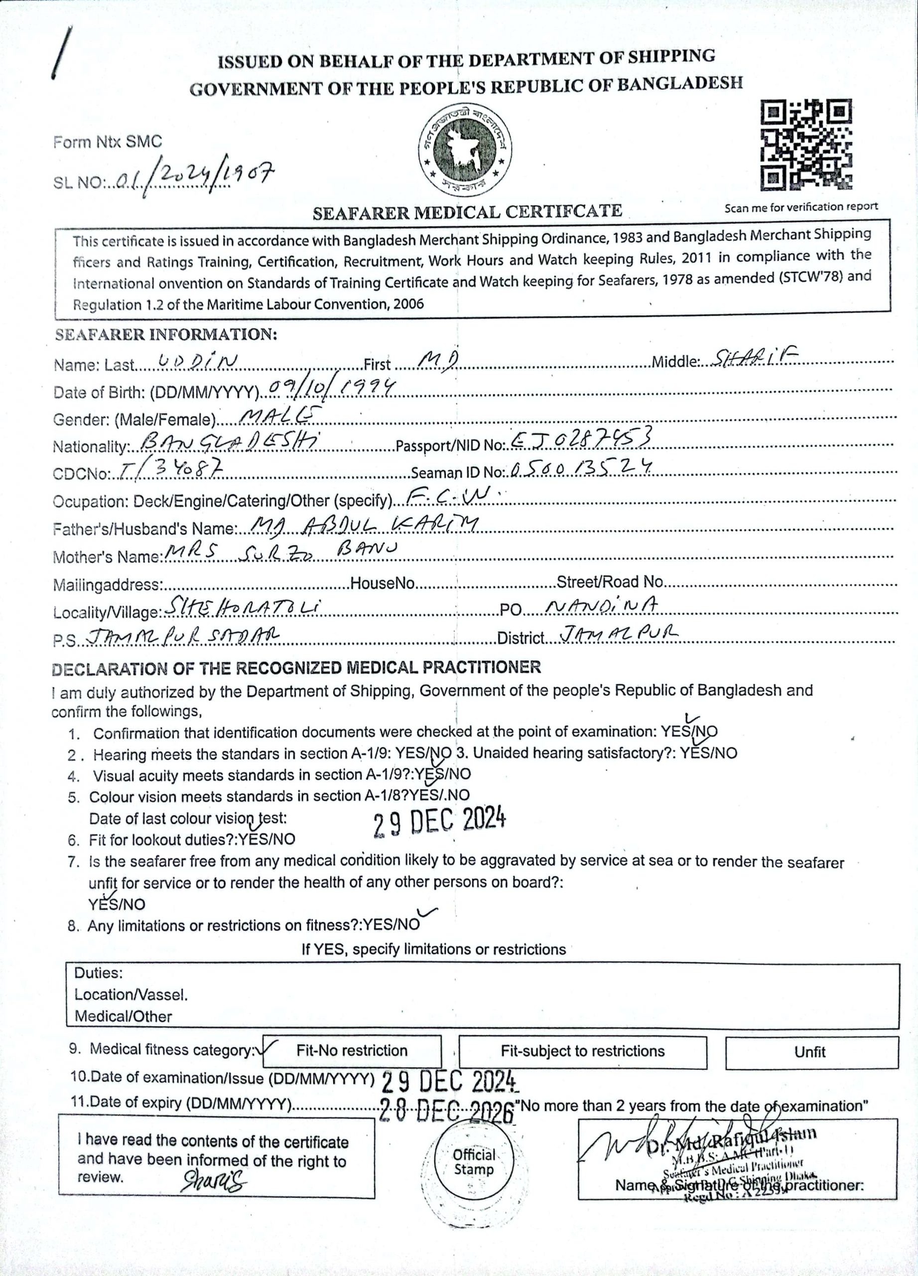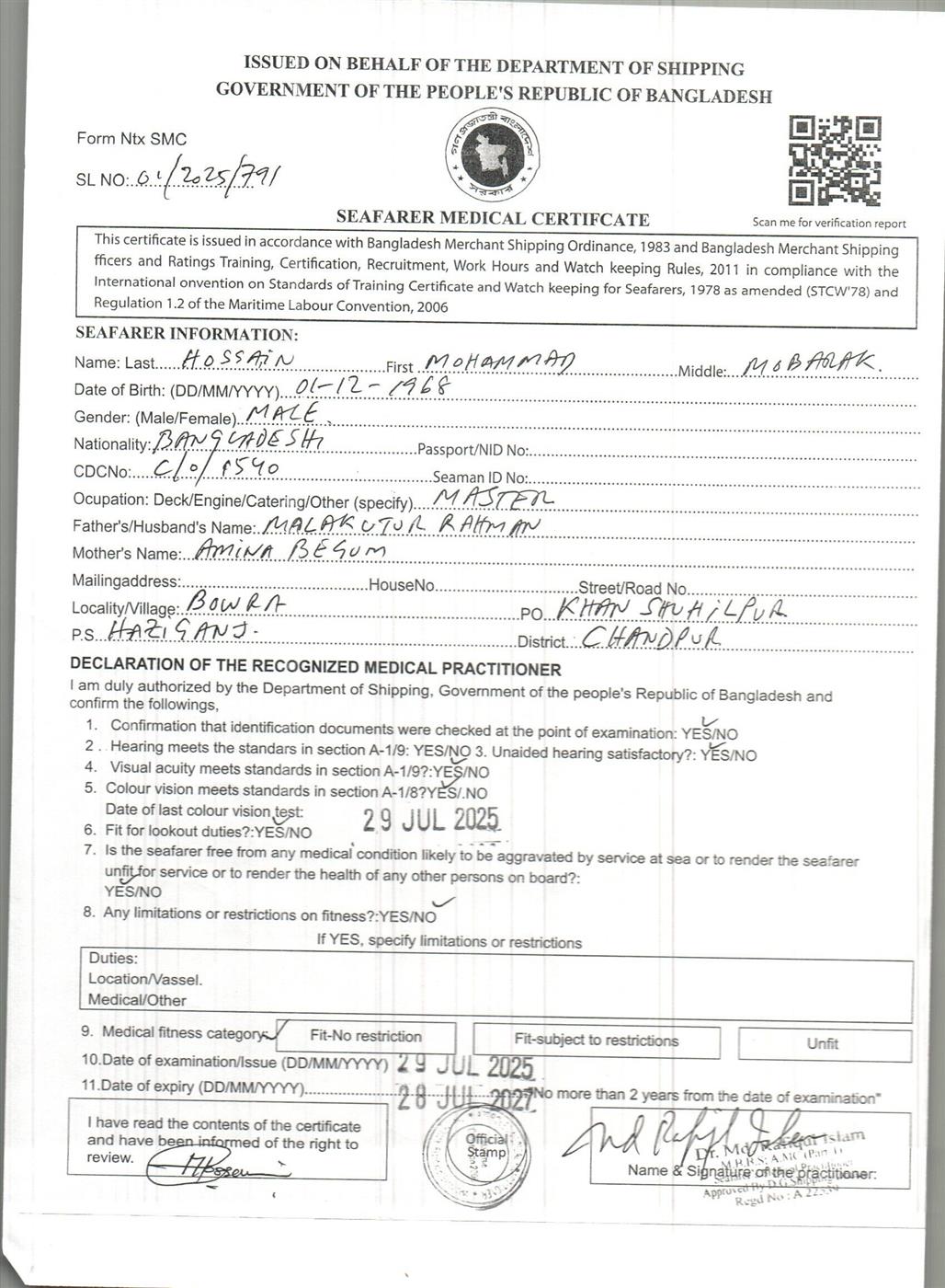 1.. SEAFARER MEDICAL CERTIFICATE