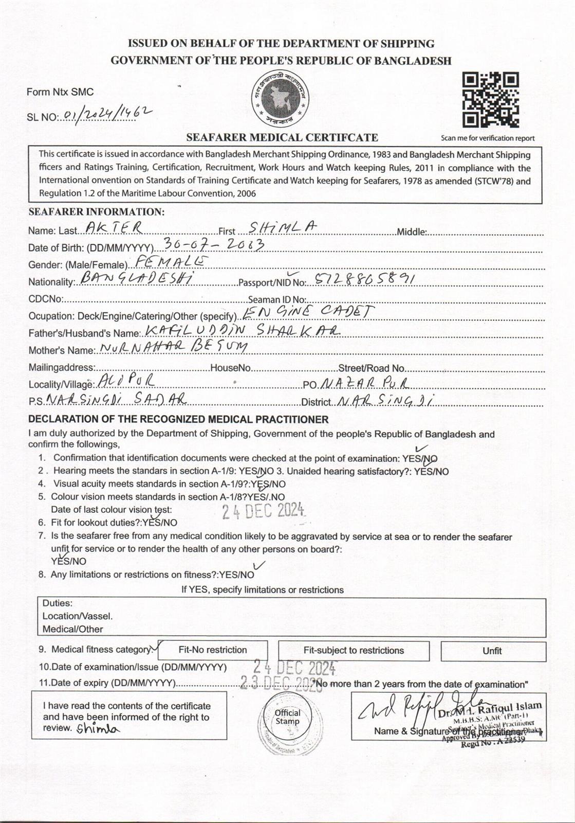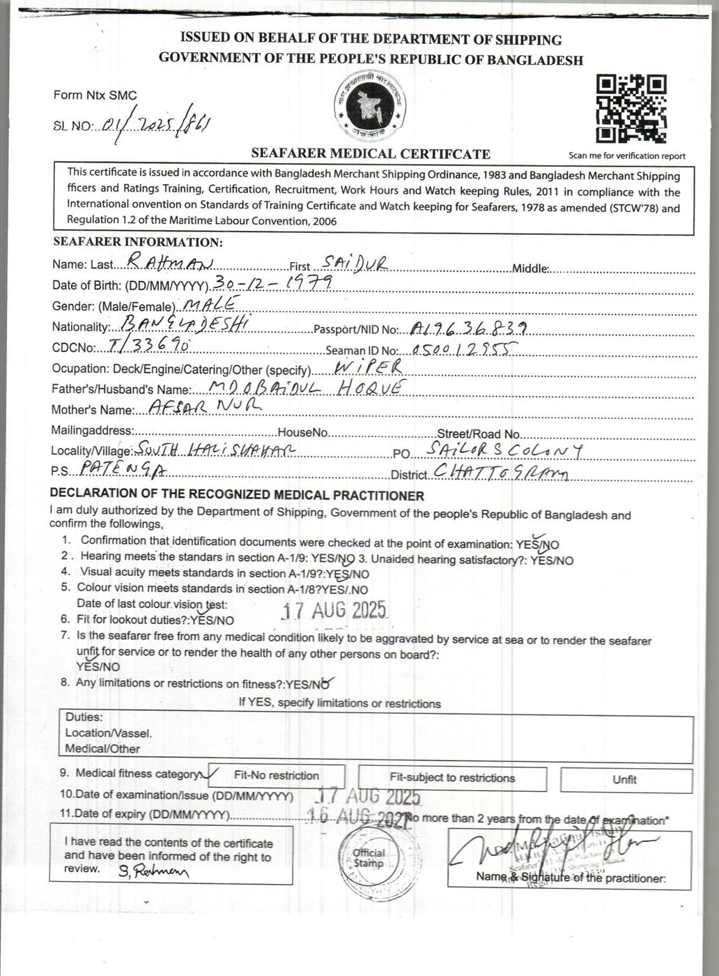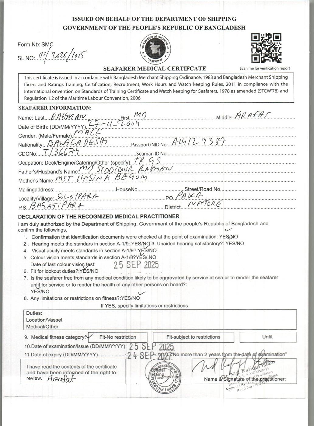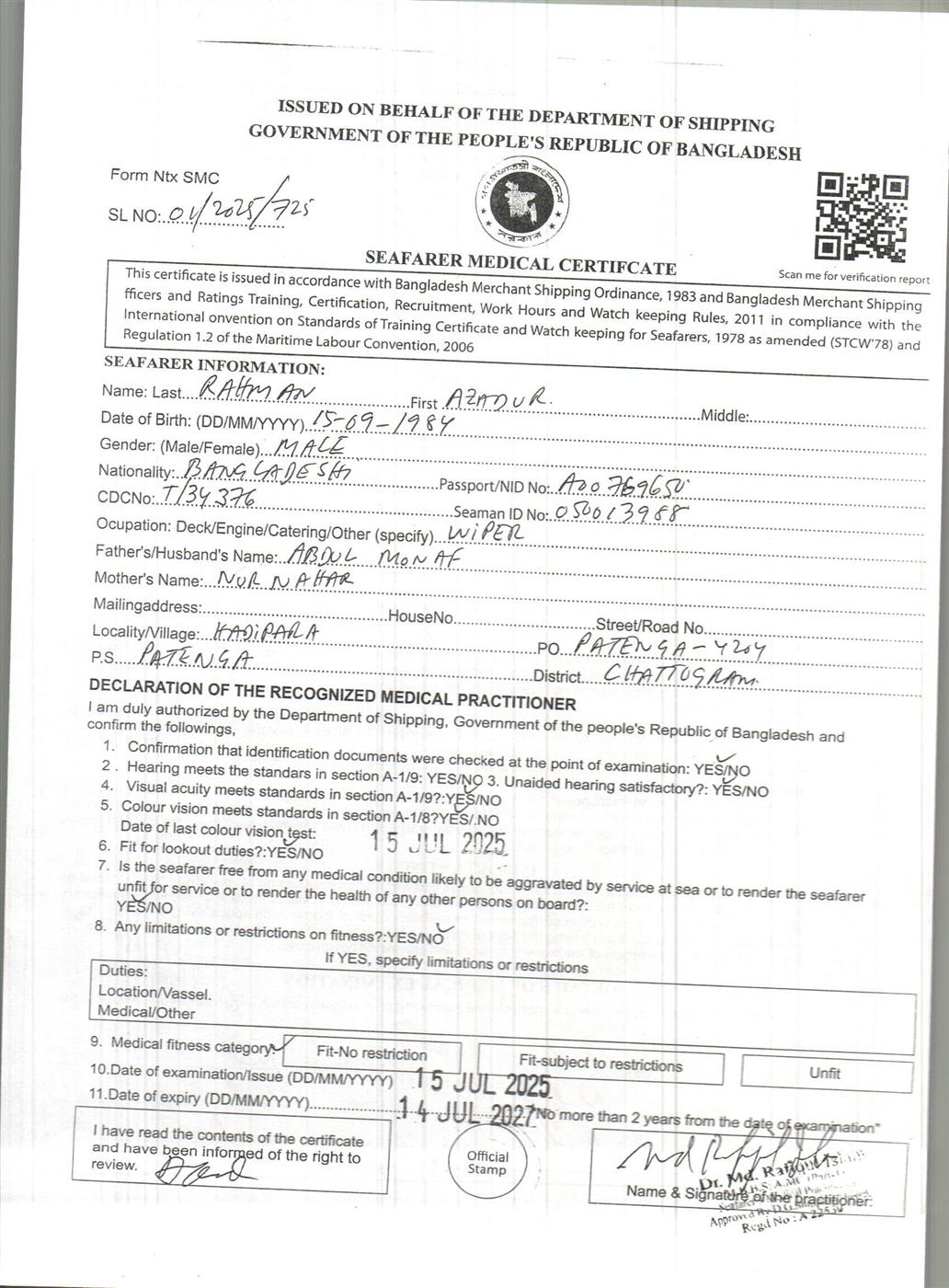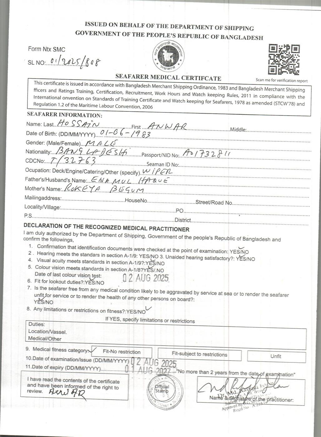 1.. SEAFARER MEDICAL CERTIFICATE
