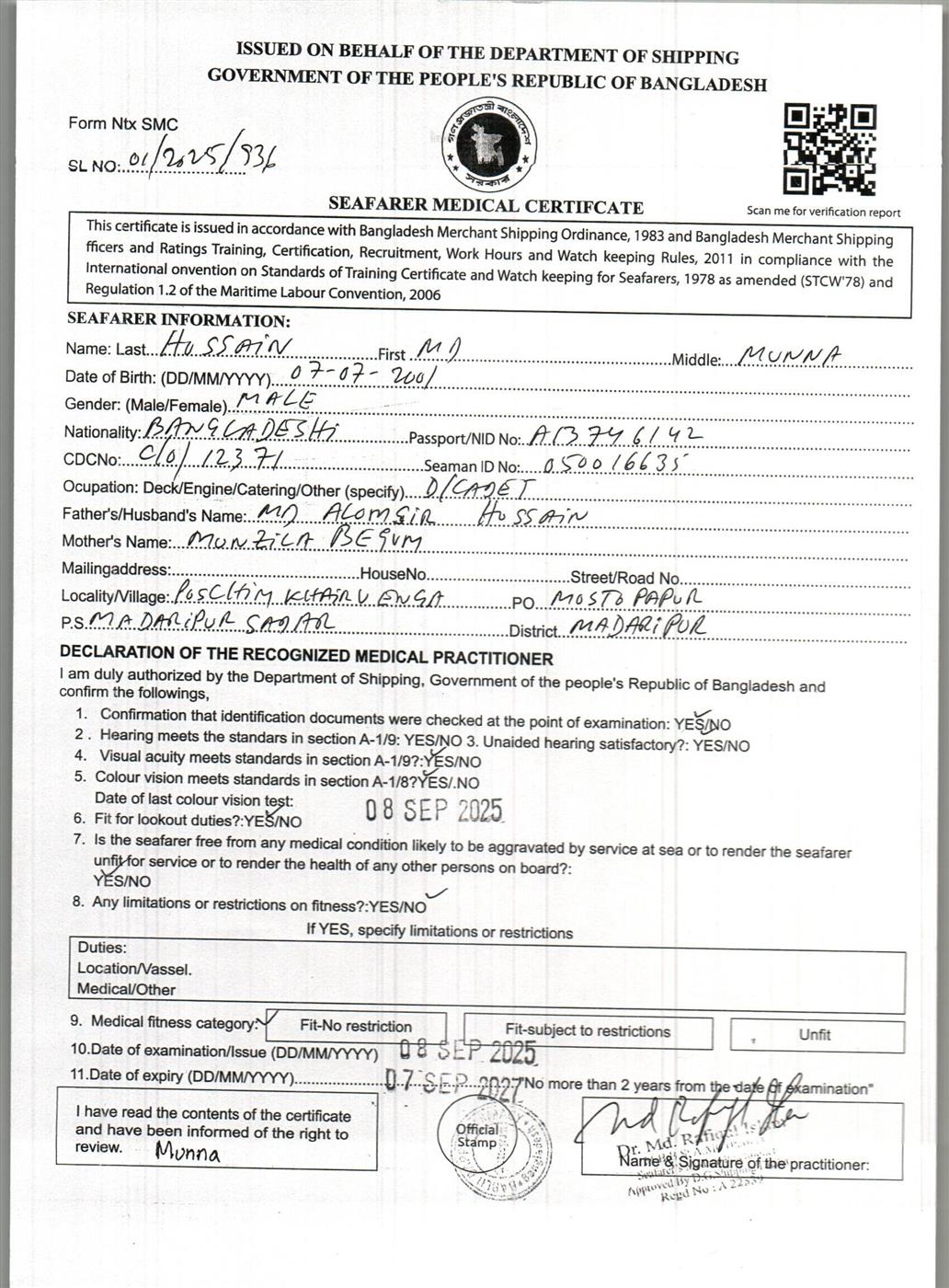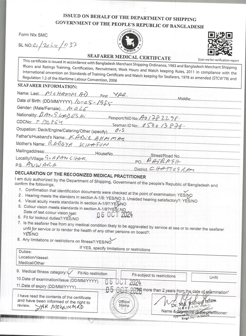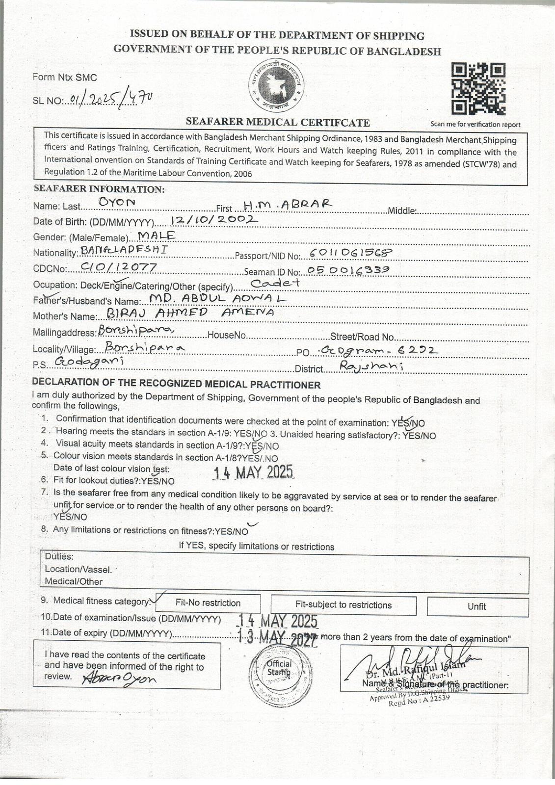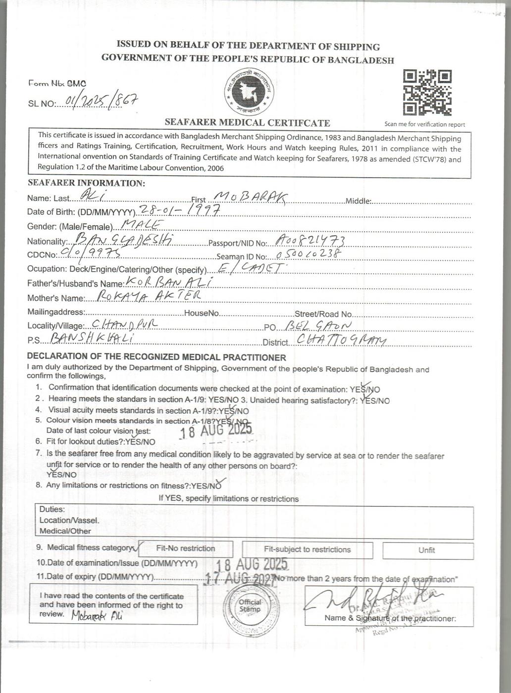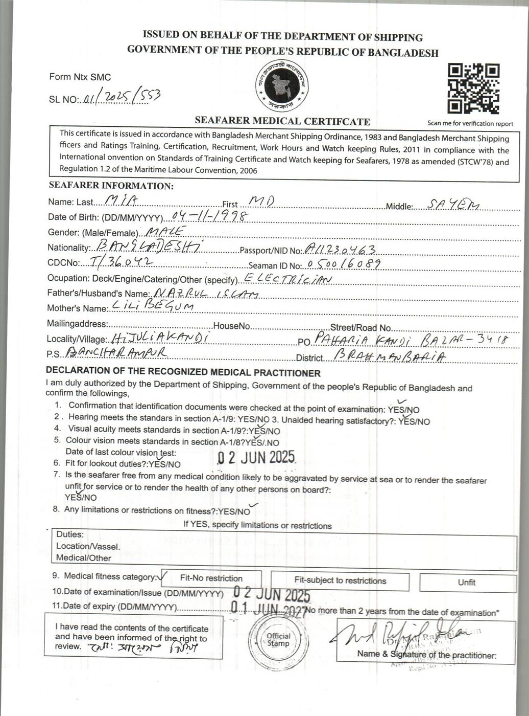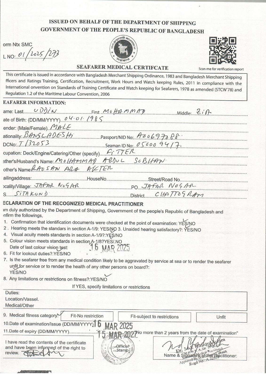 1.. SEAFARER MEDICAL CERTIFICATE