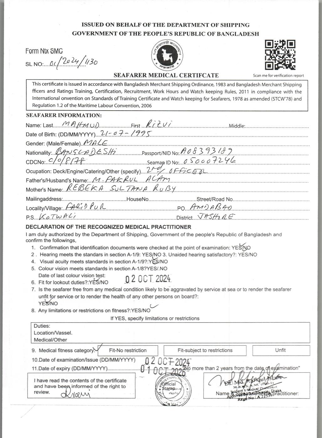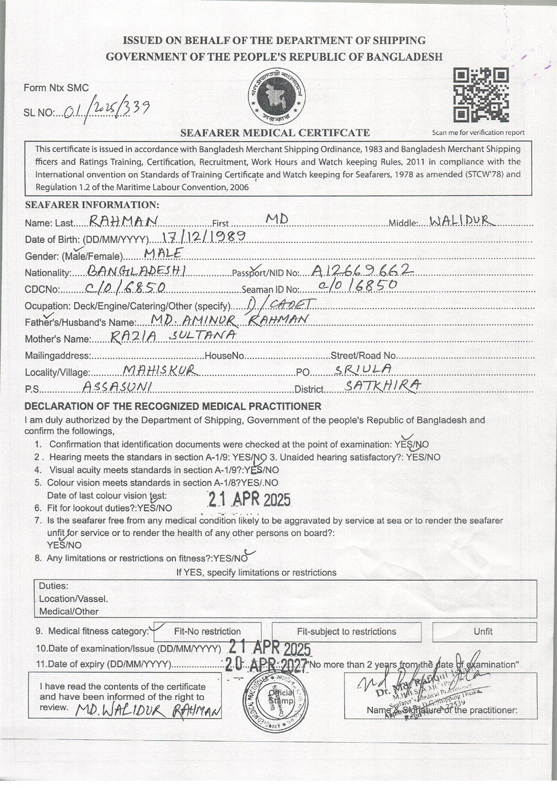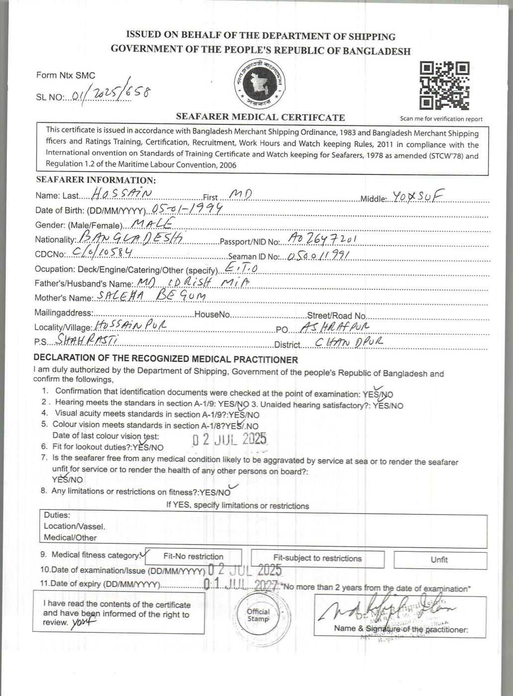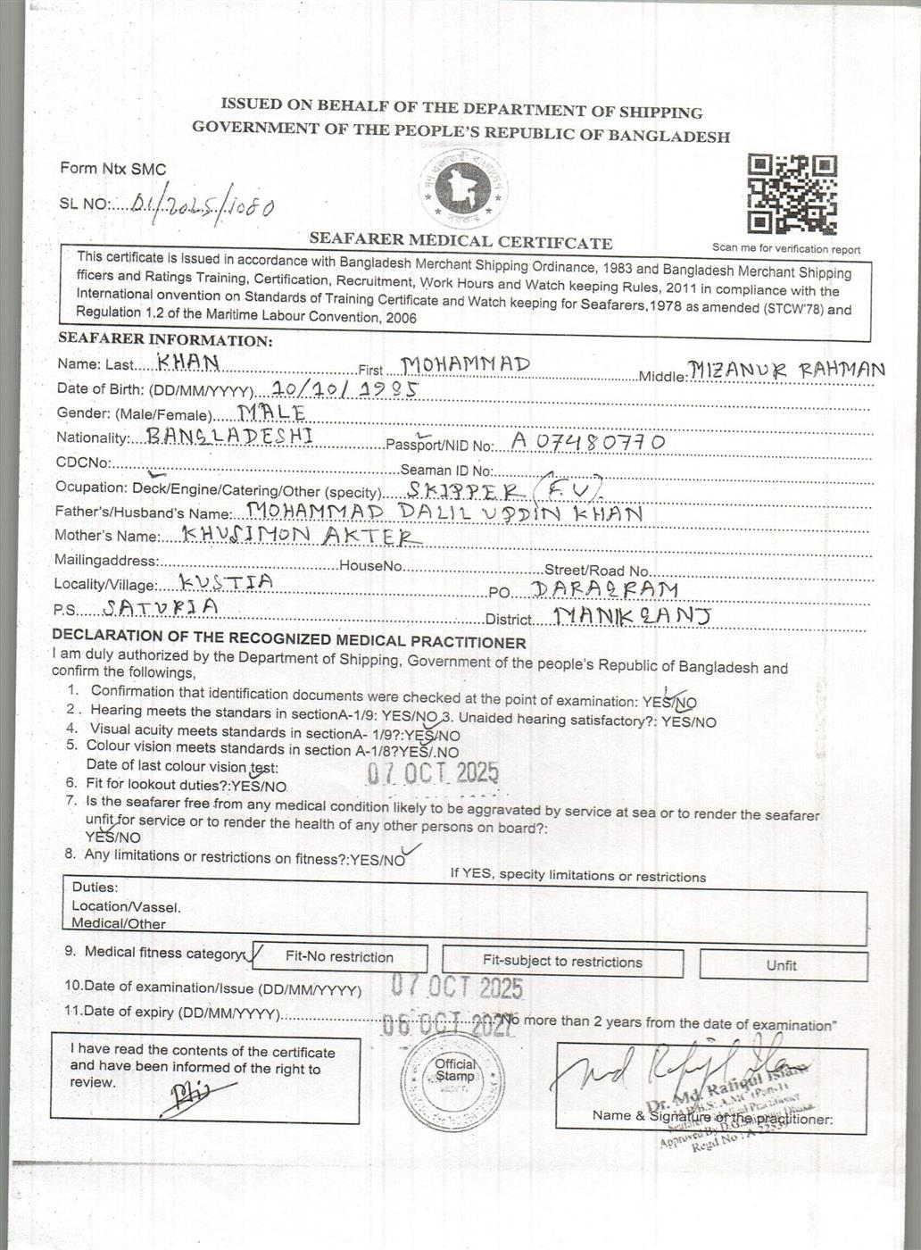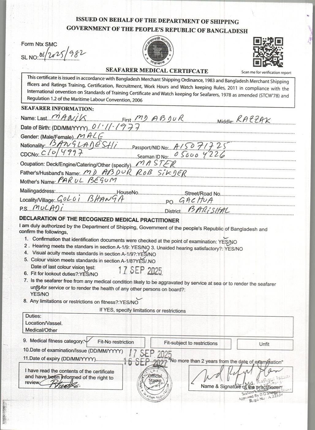 1.. SEAFARER MEDICAL CERTIFICATE