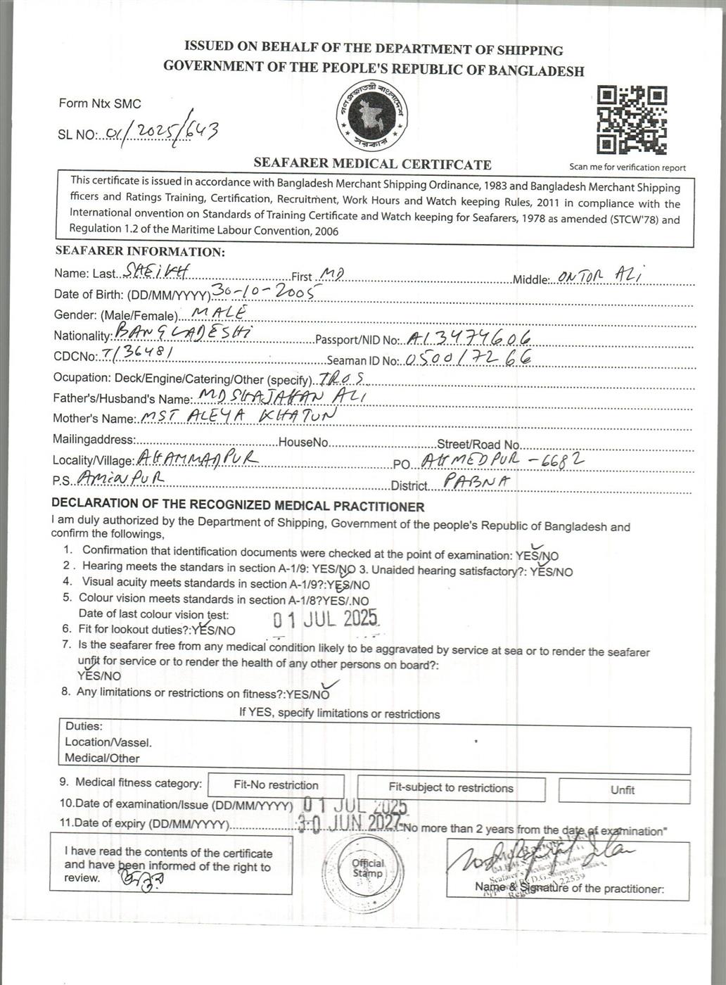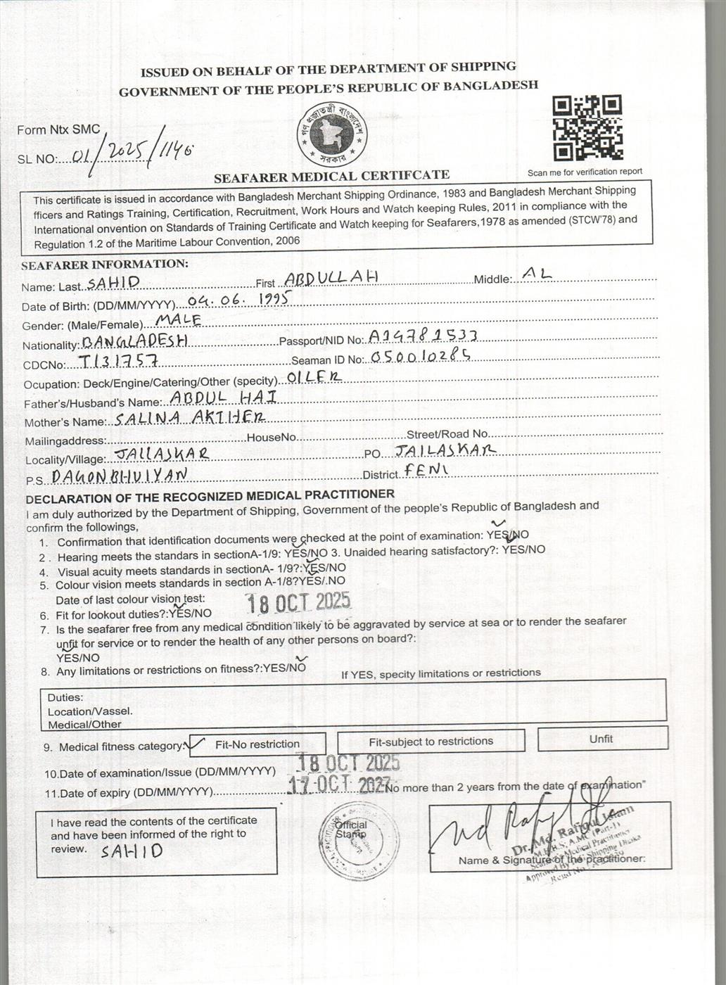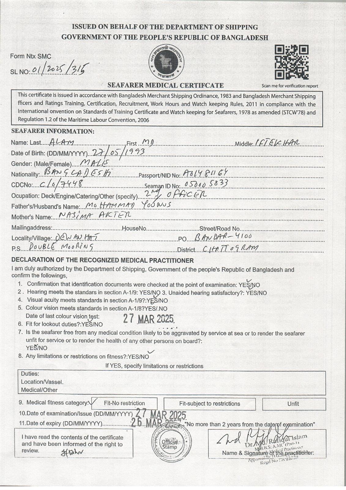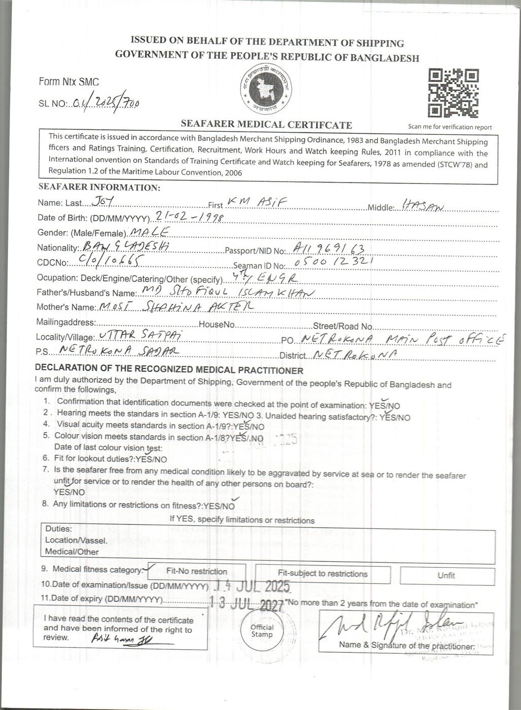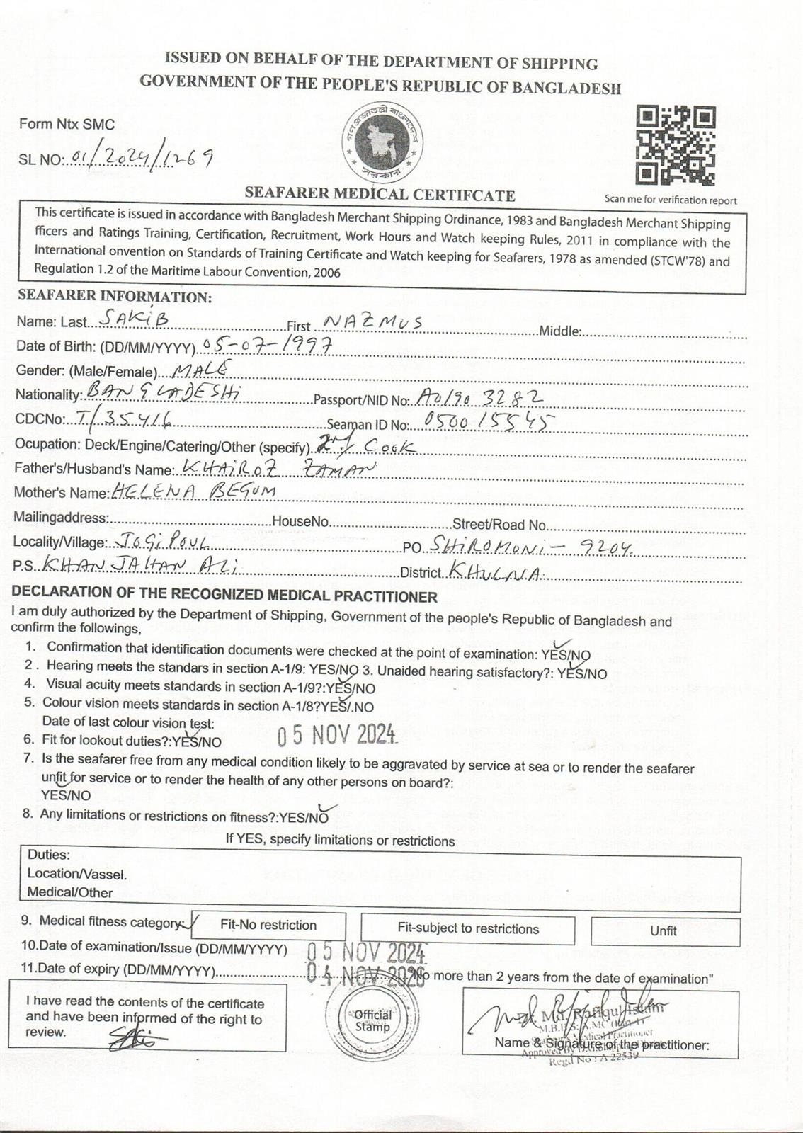1.. SEAFARER MEDICAL CERTIFICATE