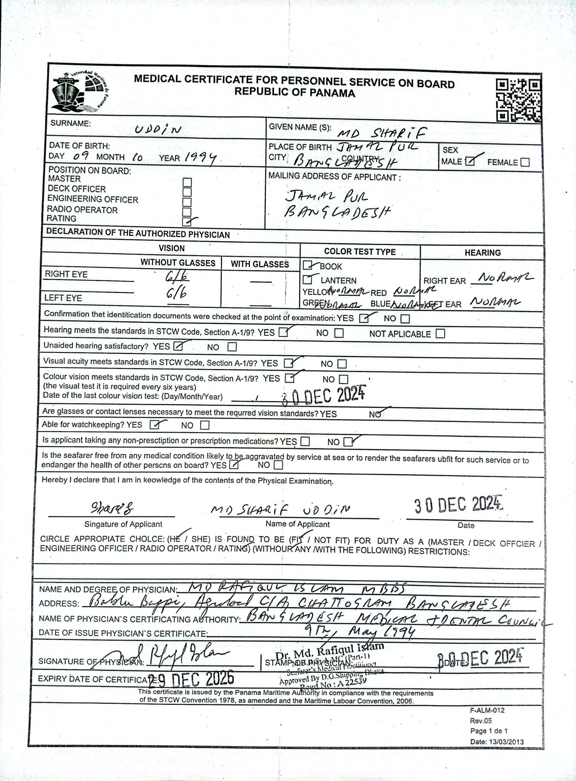PANAMA FLAG MEDICAL CERTIFICATE